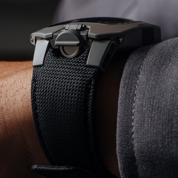 อีกหนึ่งองค์ประกอบเพิ่มเติมด้านสัดส่วนและความลื่นไหลนี้ ยังมอบไว้โดยการประกอบด้วยหูตัวเรือนบน UR-120 ซึ่งแทบไม่เคยมีมาก่อนในคอลเลกชันผลงานสร้างสรรค์ของ URWERK นอกจากนั้น หูตัวเรือนนี้ยังเป็นแบบประกบติด ซึ่งภายในหูตัวเรือนด้านที่ตรงกับตำแหน่ง 6 นาฬิกา URWERK ได้ติดตั้งไว้ด้วยสปริง สำหรับใช้ยึดประกอบสายและผูกกระชับกับข้อมือ ส่วนวัสดุของสายยังเป็นอีกหนึ่งการเปิดตัวใหม่ โดยแทนที่จะเป็นผ้าเทคนิคตามประเพณีทั่วไป URWERK ได้เลือกใช้หนังวัว พร้อมทั้งพิมพ์ประทับนูนด้วยลวดลายนำวิถี หรือแบบบอลลิสติก (ballistic-type) ชวนให้นึกถึงสัมผัสของผ้าไนลอนถัก ขณะเดียวกันก็มอบซึ่งความสะดวกสบายและความยืดหยุ่นที่เหนือกว่า