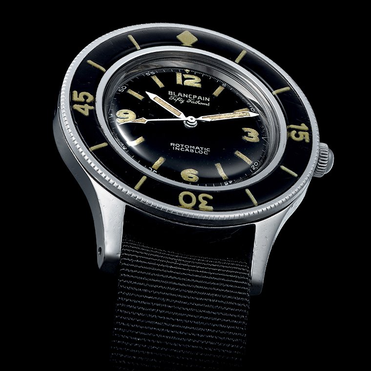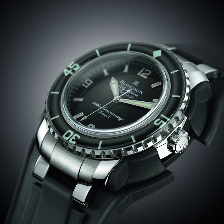 เปิดตัวครั้งแรกในปี 1953 Fifty Fathoms คือนาฬิกาดำน้ำรูปแบบโมเดิร์นเรือนแรกที่ถูกพัฒนาขึ้นโดยนักดำน้ำเพื่อตอบโจทย์ความต้องการในการสำรวจโลกใต้ทะเล มันถูกเลือกใช้โดยนักดำน้ำรุ่นบุกเบิก และเหล่าทหารเรือชั้นนำจากทั่วทุกมุมโลกในฐานะอุปกรณ์จับเวลาระดับมืออาชีพ ด้วยประสิทธิภาพในการกันน้ำ ระบบปะเก็นสองชั้นบริเวณเม็ดมะยม กลไกขึ้นลานอัตโนมัติ หน้าปัดสีเข้มที่ตัดกันอย่างชัดเจนกับสารเรือนแสงที่หลักบอกเวลา ขอบจับเวลาหมุนได้ทิศทางเดียว และคุณสมบัติในการป้องกันสนามแม่เหล็ก ทำให้ Fifty Fathoms กลายเป็นอุปกรณ์ที่ขาดไม่ได้สำหรับนักดำน้ำในการปฏิบัติภารกิจใต้ผืนทะเล
