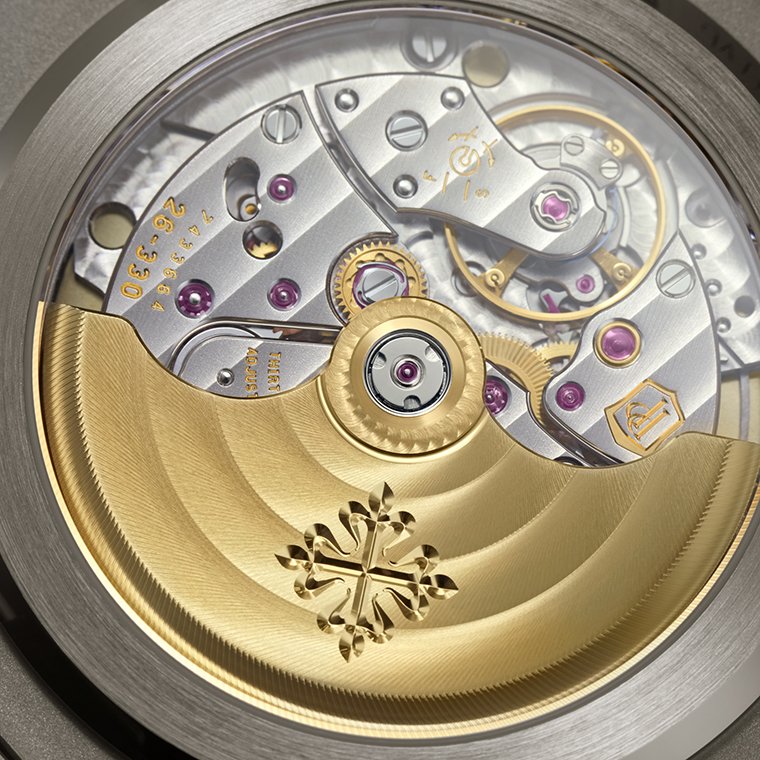 ภายในเรือนเวลา Nautilus Reference 5811/1G บรรจุไว้ด้วยกลไก in-house อัตโนมัติ Cal. 26-330 S C ที่ผลิตขึ้นเพื่อทดแทนกลไก Cal. 324 เมื่อปี 2019 มาพร้อมกับระบบ “stop-seconds” สามารถหยุดวินาทีขณะตั้งเวลาได้ หากพลิกตัวเรือนมาที่ด้านหลัง จะเห็นโรเตอร์ขึ้นลานทองคำ 21K สำหรับหมุนเหวี่ยงรับพลังงานผ่านฝาหลังกรุกระจกแซฟไฟร์ใส กลไกเครื่องนี้ประกอบขึ้นจากชิ้นส่วนทั้งหมด 212 ชิ้น ประกอบด้วยบาลานซ์ Gyromax® และสปริงบาลานซ์ Spiromax® ทำงานด้วยความถี่ 28,800 ครั้งต่อชั่วโมง ติดทับทิมกันสึกหรอ 30 ชิ้น สะสมพลังงานได้ยาวนาน 45 ชั่วโมง รับประกันคุณภาพและความเที่ยงตรงของกลไกด้วยตราประทับ Patek Philippe Seal