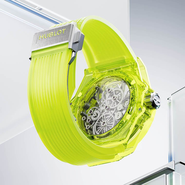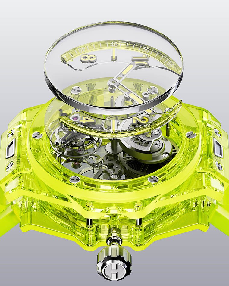 การผลิตขึ้นใหม่ของตัวเรือนโปร่งแสงภายใต้เฉดสีสว่างไสวและส่องแสงเรืองของสีเหลืองแบบนีออนนั้น อาจดูคล้ายกับเป็นแนวคิดที่ง่ายดาย ทว่า แท้จริงแล้วนั้น มันคือความซับซ้อนอย่างเหลือเชื่อในการสร้างสรรค์ กับเฉดสีเหลืองที่เป็นสีนีออนเรืองแสงสว่างไสวและเปี่ยมด้วยพลัง ซึ่งยังคล้ายกับสามารถเรืองแสงได้จากด้านในเสมือนกับวัสดุเรืองแสงในตัวเอง ด้วยเฉดเรืองแสงเข้มข้นของสีเหลืองสดแบบเลมอนอันเป็นเอกลักษณ์ และเพื่อให้บรรจบกับความท้าทายทางเทคนิคขั้นสูงนี้ Hublot (อูโบลท์) จำเป็นต้องเสาะหากรรมวิธีเฉพาะทางเทคโนโลยีอวกาศ ซึ่งก่อนหน้านี้ SAXEM (ซาเซม) ได้ถูกพัฒนาขึ้นในวงการเทคโนโลยีดาวเทียม โดยเป็นวัสดุที่มีเอกลักษณ์เฉพาะตัว และเคยถูกนำมาใช้มาแล้วในปี ค.ศ. 2019 สำหรับนาฬิการุ่น Big Bang MP-11 (บิ๊ก แบง เอ็มพี-11) ของ Hublot
