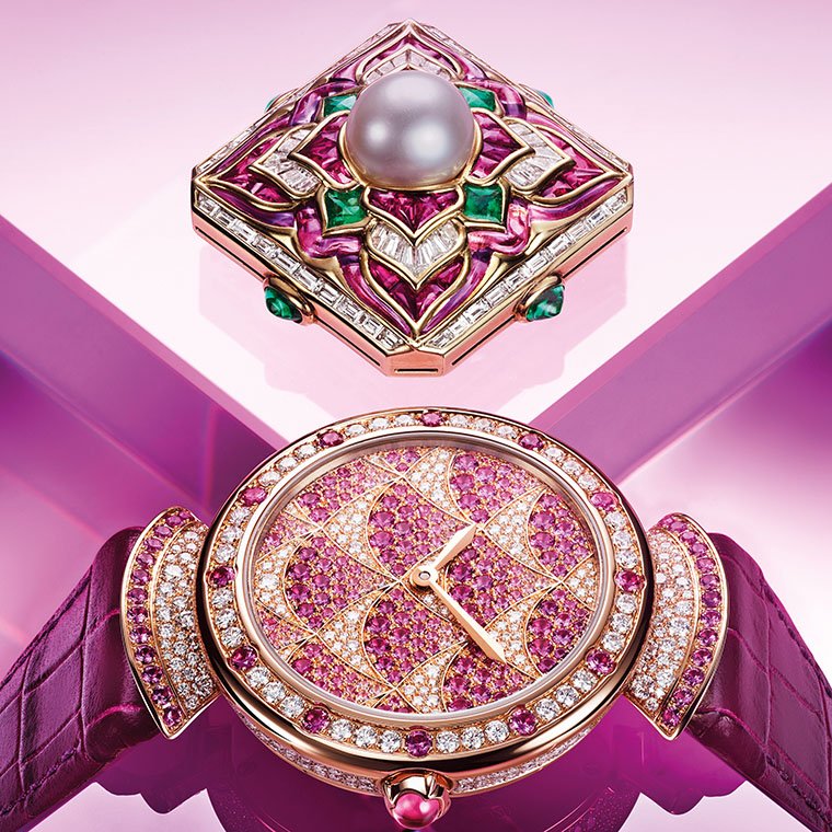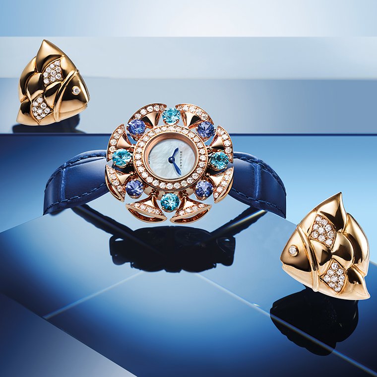 เรือนเวลา Divas’ Dream Mosaica สองรุ่นใหม่อันล้ำค่า ได้แสดงออกอย่างแท้จริงถึงความเชี่ยวชาญในเครื่องประดับอัญมณีและการประดิษฐ์นาฬิกาของ Bulgari ด้วยหน้าปัดประดับอัญมณีเต็มพื้นที่กับลวดลายรูปทรงพัดที่เชื้อชวนให้หวนนึกถึงลวดลายโมเสกซึ่งตกแต่งภายในโรงอาบน้ำคาราคัลลา กับการไล่เฉดสีของแซฟไฟร์อย่างลุ่มลึก นับจากสีชมพูอ่อนจนถึงสีแดงม่วงสำหรับเวอร์ชันแรกของโรสโกลด์ และนับจากสีฟ้าสกายบลู (sky blue) จนถึงสีอซัวร์ (azure) สำหรับรุ่นที่สองภายใต้รูปโฉมของไวท์โกลด์ แถบคาดตกแต่งทำจากทองขัดเงายังเสริมขอบอันคมชัดให้กับงานออกแบบนี้ และตัดกับพื้นหลังของการประดับเพชรเจียระไนบริลเลียนต์คัต อัญมณีสีสดใสได้มอบความสว่างไสวให้กับชั่วโมงต่างๆ บนขอบตัวเรือน และเม็ดมะยมที่ประดับด้วยเพชรเจียระไนคาโบชองคัตอันเป็นสัญลักษณ์ของบุลการี