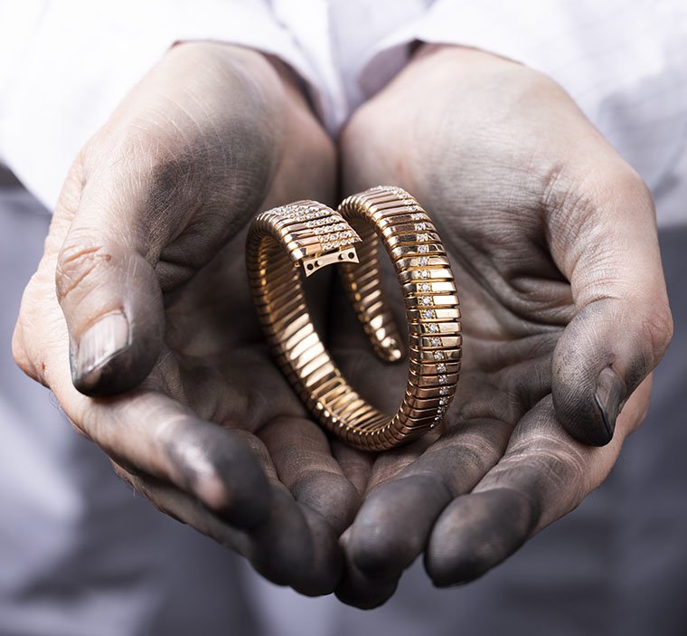 งูแห่งตำนานของ Bulgari กล้าที่จะอยู่ภายใต้การเปลี่ยนแปลงและเปลี่ยนรูปครั้งใหม่เสมอ เมื่องูตัวนี้ได้เลื้อยเข้าสู่ผิวอันล้ำค่าและสร้างสรรค์อย่างไม่มีสิ้นสุด ด้วย Serpenti Tubogas Infinity และสำหรับครั้งแรกนี้ โครงร่างของงูยังคงมาจากตัวเรือนนาฬิกาทั้งหมดไล่เรื่อยไปจนจรดสายสร้อยข้อมือ อันเป็นผลลัพธ์มาจากการประดับตกแต่งอัญมณีอย่างประณีตไว้บนโครงสร้างแบบโมดูลของผลงาน ส่วนวงแหวนต่างๆ นั้นถูกขึ้นรูปอย่างวิจิตร ซึ่งแต่ละชิ้นล้วนมีสัดส่วนเฉพาะตัวต่างกัน ก่อนที่จะผ่านการขัดเงา ประดับตกแต่งอัญมณี และประกอบกันบนแผ่นไทเทเนียม ผลลัพธ์ที่ได้นั้นคือ Serpenti Tubogas Infinity งูตัวใหม่อันเจิดจรัสแวววาวของ Bulgari ด้วยประกายแสงระยิบระยับของเพชรที่ขยายไปยังส่วนหัวของงู พร้อมจุดประกายแสงด้วยการประดับตกแต่งแบบสโนว์เซ็ตติ้งบนหน้าปัด รวมถึงขอบตัวเรือนประดับอัญมณี และเพชรแปดเม็ดบนความโค้งของตัวเรือนทั้งหมดยังจำเป็นต้องอาศัยเพียงความเชี่ยวชาญระดับสูง ขณะที่เมซงจากโรมนี้ยังนำเสนอการแสดงออกครั้งใหม่ของนาฬิกา Serpenti ไว้ในสองเวอร์ชันแรก โดยติดตั้งตามลำดับด้วยสายสร้อยข้อมือแบบพันหนึ่งขดหรือพันสองขด ซึ่งเป็นเทคนิคที่สืบทอดมาจากอิสรภาพแห่งการสร้างสรรค์อย่างไร้พรมแดน ทั้งสองรุ่นใหม่ผ่านการคิดค้นขึ้นเสมือนกับผิวหนังที่สอง และยังคงเดินหน้าเฉลิมฉลองให้กับความเชื่อมโยงอย่างใกล้ชิดและแน่นแฟ้นระหว่าง Serpenti และผู้สวมใส่