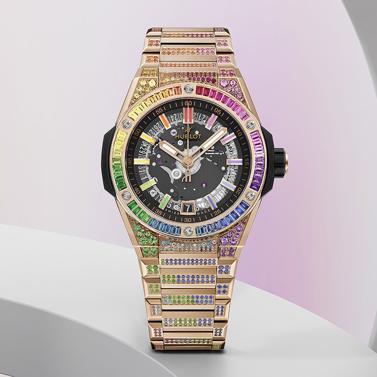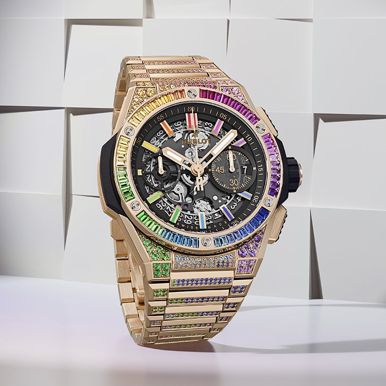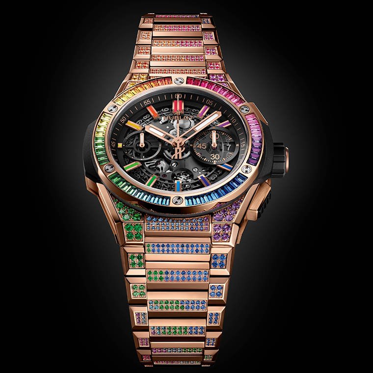 โดยภายในนาฬิกาสองรุ่นนี้มิได้ถ่ายทอดไว้เพียงการประดับอัญมณีแบบเรียบง่าย แต่เป็นการประดับตกแต่งแบบเต็มพื้นที่จากตัวเรือน เรื่อยไปถึงขอบตัวเรือนและบรรจบกับสายสร้อยข้อมือ ประกอบด้วยอัญมณีล้ำค่าที่ถูกจัดวางบนตำแหน่งแบบไล่เฉดไปตามแร่อัญมณีสีอันงดงามสูงสุด ทั้ง ทับทิม, อเมทิสต์, โทแพซสีน้ำเงิน, ซาโวไรท์ เช่นเดียวกับแถบสีสดใสทั้งหมดของแซฟไฟร์ ทั้งสีชมพู สีส้ม สีฟ้า และสีเหลือง แต่ละอัญมณีอันเปล่งประกายนี้ยังมาพร้อมเหลือบสีที่มีเอกลักษณ์เฉพาะตัว ผสานความลุ่มลึกของสีที่ได้ผ่านการจับคู่ทีละคู่ ซึ่งเป็นผลลัพธ์มาจากสายตาและมืออันเชี่ยวชาญของเหล่าช่างประดับอัญมณีระดับมาสเตอร์ โดยมีอัญมณีทั้งหมด 174 เม็ด สำหรับรุ่น Big Bang Integrated (บิ๊ก แบง อินทิเกรเต็ด) และ 176 เม็ด สำหรับรุ่น Time Only รวมถึงสายสร้อยข้อมือของแต่ละผลงานที่ประดับด้วยอัญมณีทั้งหมด 768 และ 748 เม็ดตามลำดับ