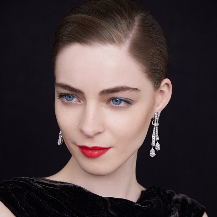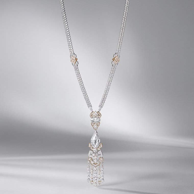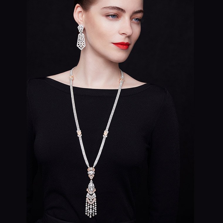 สร้อยคอ Roaring Twenties long necklace (รอริง ทเว็นตีส์) กับต่างหู Chrysler (ไครส์เลอร์) ดัดแปลงรูปทรง พลิกแพลงวิธีสวมใส่ได้ ตัวเรือนทองคำขาวประกอบทองคำสีกุหลาบ จี้สร้อยคอโดดเด่นด้วยเพชรเดี่ยวทรงหยดน้ำเจียระไนเหลี่ยมกุหลาบคุณภาพระดับ DIF Type 2A ขนาด 10.32 กะรัตกับเพชรเดี่ยวทรงวงรีเจียระไนเหลี่ยมกุหลาบน้ำหนัก 4.46 กะรัตประดับเพชร