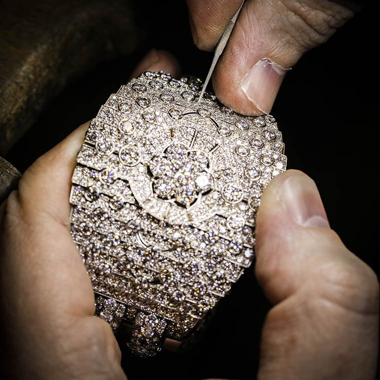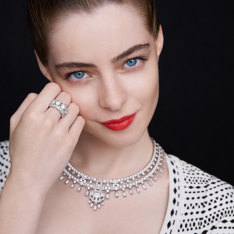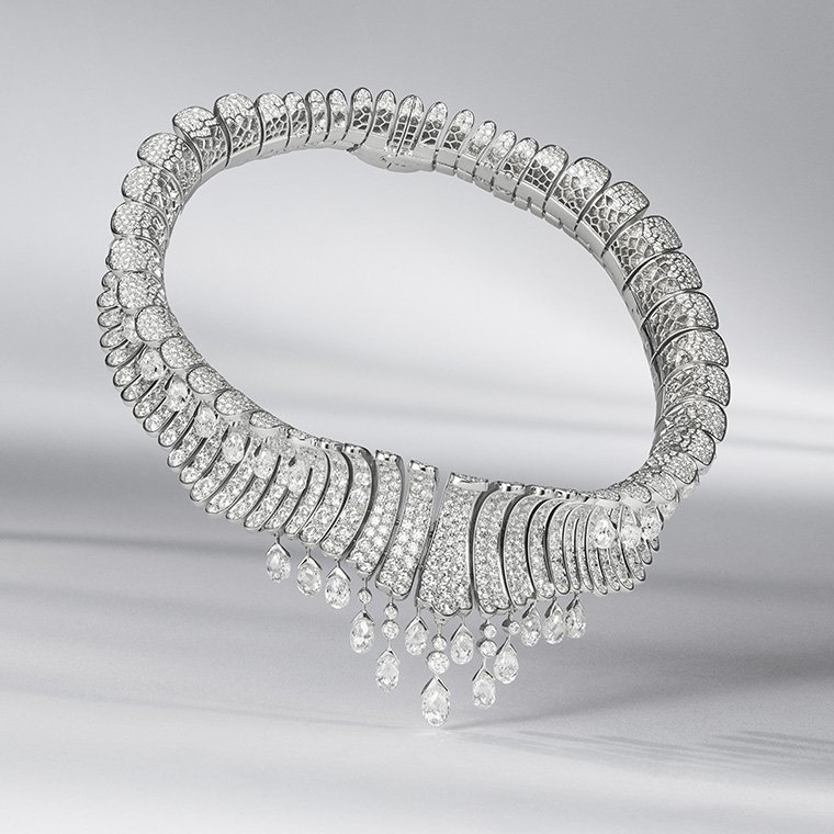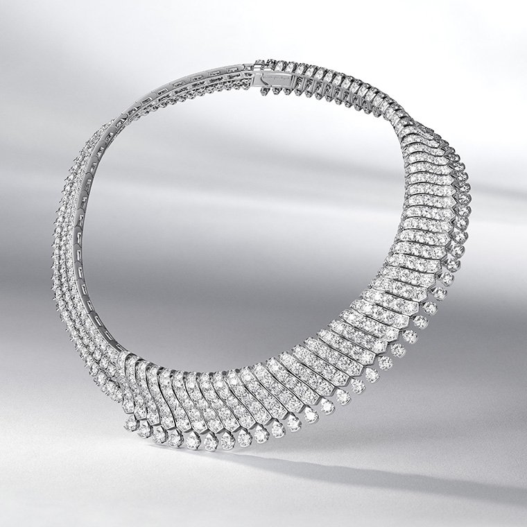 ชื่อซึ่งสื่อความหมายตรงตัวว่า “ทศวรรษ 1950 อันสุดบรรเจิด” ของสร้อยคอ Fabulous Fifties (ฟาบูลัส ฟิฟตีส์) คือตัวแทนเสน่ห์หรูหราในครั้งอดีตผ่านการใช้เส้นรูปทรงจุดประกายความทรงจำถึงกระแสธารเพชรระยับแสงสุกสว่างกลางจอภาพยนตร์ขาว-ดำ ในยุคทองของฮอลลีวูด อันส่งผลให้บรรดาเมซง หรือผู้ผลิตเครื่องประดับอัญมณีชั้นสูงทั้งหลายมีชื่อเสียงโด่งดังเป็นที่รู้จักไปทั่วโลก โครงสร้างเปิดโปร่งของสร้อยคอเส้นนี้ ประกอบขึ้นจากชิ้นส่วนที่ผ่านการออกแบบ คำนวณสัดส่วน และน้ำหนักมาอย่างระมัดระวังเพื่อให้ตัวเรือนมีน้ำหนักเบา สวมสบายเป็นอย่างยิ่ง โมทิฟชิ้นต่างๆ ของแผงสร้อยตัวเรือนบอบบาง สวมแนบฐานลำคอเส้นนี้ ได้รับการสรรค์สร้างขึ้นอย่างวิจิตรประณีตเพื่อให้ทิ้งตัวลงแนบผิวสรีระของผู้สวมใส่อย่างลงตัว และงดงาม โครงสร้างรองรับการฝังเพชรน้ำซึ่งผ่านการเจียระไนหลากรูปทรง ทั้งเพชรกลม, ทรงเหลี่ยมจัตุรัส, สี่เหลี่ยมคางหมู และสี่เหลี่ยมผืนผ้าบาแก็ตต์ รวมถึงเทคนิคฝังอัญมณีขึ้นตัวเรือนแบบต่างๆ ไม่ว่าจะเป็นฝังสอดลงรางหนีบ, ฝังหุ้มรอบขอบเพชร, ฝังหุ้มหัว-ท้าย และฝังจมเดินลายเกล็ด สำหรับโมทิฟจี้ใจกลางสายสร้อย ทุกสายตาพลันจับจ้องเพชรเดี่ยวคุณภาพระดับ DIF Type 2A เจ้าของน้ำหนัก 10.06 กะรัตเจียระไนเหลี่ยมมรกตเผยหน้าตัดรองรับการส่องผ่านของแสงเพื่อเร่งระดับความสว่างของไฟในน้ำเพชรให้จรัสประกายสุกสกาวของน้ำเพชรบริสุทธิ์หมดจดอย่างมิอาจหาถ้อยคำใดมาพรรณนา เหนืออื่นใด เทคทิคเจียระไนที่นำมาใช้ยังคำนึงถึงการเผยสัดส่วนผิวหน้าตัดพื้นที่กว้างอย่างที่เรียกว่า “คอร์ทเทนนิส” (tennis court)ซึ่งต้องให้ความสำคัญต่อสมดุลเชิงสัณฐานระหว่างความกว้างกับความยาวเป็นพิเศษ