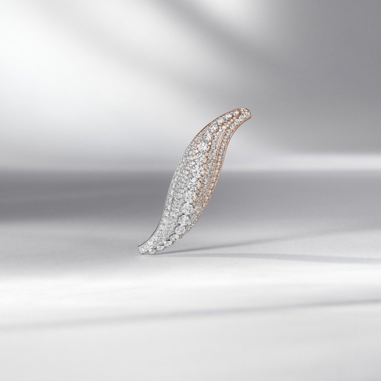 เข็มกลัดฝักถั่วอาริโกต์รุ่นใหม่ (New Haricot) คือบทรังสรรค์อันแยบคายจากเข็มกลัดเปลวอัคคี (Flame) รุ่นต้นแบบ ผลงานชิ้นสำคัญของเมซงเมื่อปี 1934 ก่อนเปลี่ยนชื่อเป็น “อาริโกต์” ในภายหลังสืบเนื่องจากรูปทรงคล้ายคลึงกับฝักถั่วฝรั่งเศส และประสบความสำเร็จอย่างต่อเนื่องกับงานออกแบบรุ่นต่างๆ ตลอดทศวรรษ 1960 โดยเฉพาะอย่างยิ่ง ชิ้นที่แจ็คเกอลีน เคนเนดีนิยมใช้เป็นเครื่องประดับประจำตัวในหลายโอกาส สำหรับผลงานรังสรรค์ใหม่รุ่นนี้ โดดเด่นเป็นหนึ่งด้วยการใช้ทองคำขาวร่วมกับทองคำสีกุหลาบหล่อแบบเป็นโมทิฟแยกชิ้นก่อนนำมาประกบตัวเรือนรอบชิ้นส่วนแกนกลาง จุดเด่นสะดุดตาของเข็มกลัดชิ้นนี้อยู่ที่งานฝังเพชรกลมเม็ดใหญ่ไล่ลำดับขนาดลงบนเขี้ยวหนามเตยท่ามกลางงานฝังเพชรจิกไข่ปลาเรียงแถวอย่างสม่ำเสมอ กลมกลืนกันทั่วทั้งชิ้นงาน ความใส่ใจในรายละเอียดอันเป็นแบบฉบับเฉพาะ Van Cleef & Arpels ยังสะท้อนผ่านเขี้ยวหนามเตยโลหะทองสองโทนสีที่รองรับบรรดาเพชรลูกกลางตัวเรือนเพื่อทวีความโดดเด่นให้แก่ลูกเล่นไล่เฉดโทนอย่างละเมียดละไม