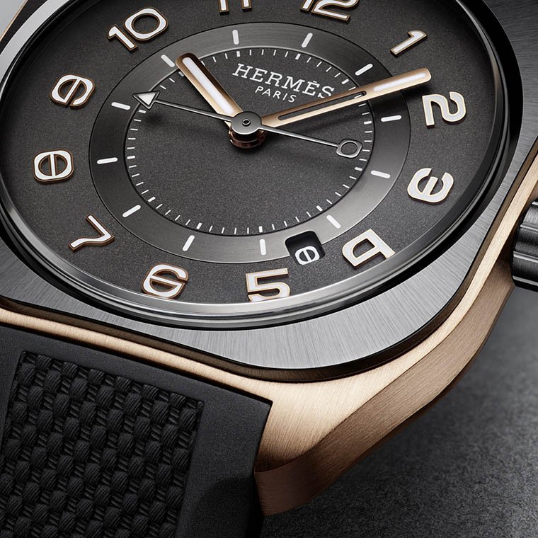 รังสรรค์ขึ้นภายใต้โลหะผสมอันแข็งแรงและน้ำหนักเบา กับตัวเรือนทรงสี่เหลี่ยมมนหรือคุชชันของนาฬิกา Hermès H08 ที่ประกอบด้วยฝาหลังตัวเรือนทำจากไทเทเนียม เคลือ DLC สีดำ ส่วนด้านบนของตัวเรือนชิ้นกลางทำจากโรสโกลด์ การเล่นบนความแตกต่างกันนี้ยังเสริมเสน่ห์ยิ่งขึ้นด้วยขอบตัวเรือนและเม็ดมะยมเซรามิกสีดำซึ่งสลับระหว่างการตกแต่งแบบขัดด้านซาตินและขัดเงา ขณะที่ตัวเรือนแบบทูโทนได้ฉายความโดดเด่นให้กับมิติอันลุ่มลึกของหน้าปัดตกแต่งแบบเกรนอย่างประณีตในเฉดสีดำ ซึ่งตัดกับเข็มชี้ทองเรืองแสงและตัวเลขอารบิกทอง มอบเป็นความชัดเจนอันสมบูรณ์แบบ ขณะที่ดิสก์นาทีกลางและเข็มวินาทีเคลือบด้วยนิกเกิลสีดำ พร้อมทั้งการแสดงวันที่ภายใต้ช่องหน้าต่างทรงคุชชัน ณ ตำแหน่งระหว่าง 4 และ 5 นาฬิกา ถ่ายทอดซึ่งการแสดงอันสมดุล สวยงาม และอ่านค่าได้อย่างชัดเจน โดยการขับเคลื่อนของกลไกจักรกลไขลานอัตโนมัติ Manufacture Hermès H1837 ประกอบลงตัวมากับสายผ้าสีดำและสีเทาแอนทราไซต์ หรือสายยางสีดำ พร้อมทั้งตัวพับล็อกสายทำจากไทเทเนียม เคลือบ ดีแอลซี ตอกย้ำถึงความสง่างามของนาฬิการุ่นนี้ได้อย่างสมบูรณ์