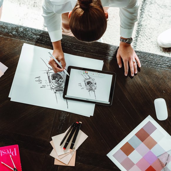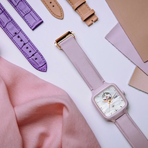 “เราเลือกหนังสีชมพูอ่อนๆ มาแมตช์กับตัวเรือนไฮเทคเซรามิกซึ่งเป็นโครงสร้างหลัก เสริมด้วยหน้าปัดเปลือกหอยมุกที่เจาะเป็นวงให้เห็นด้านใน ทำให้นาฬิกาทรงสี่เหลี่ยมนี้โดดเด่น หรูหรา และดูมีมิติหลากหลายพอให้ใส่ได้ทุกโอกาส ทั้งกลางวันและกลางคืน