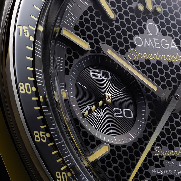 Speedmaster Super Racing รุ่นใหม่มาพร้อมกับตัวเลือกสายโลหะ และตัวเลือกสุดสปอร์ตอย่างสาย NATO ไนลอนรีไซเคิลลายแถบสีดำและสีเหลืองซึ่งอ้างอิงมาจากรหัสสีอันโดดเด่นของ Seamaster Aqua Terra >15’000 GAUSS ที่เปิดตัวเมื่อ 10 ปีก่อน