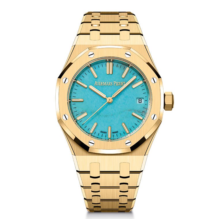 Audemars Piguet (โอเดอมาร์ ปิเกต์) แบรนด์เครื่องบอกเวลาชั้นสูงจากประเทศสวิตเซอร์แลนด์ เปิดตัวเวอร์ชันใหม่ของนาฬิการุ่น Royal Oak Selfwinding ขนาดหน้าปัด 37 มิลลิเมตรที่รังสรรค์ขึ้นด้วยทองคำ 18 กะรัตทั้งเรือน พร้อมหน้าปัดที่ดูโดดเด่นสะดุดตาด้วยเทอร์ควอยซ์ธรรมชาติ การผสมผสานวัสดุที่ล้ำค่านี้ทำให้นาฬิกามีความโดดเด่นเปล่งประกายอย่างที่ไม่เคยมีมาก่อน เทอร์ควอยซ์ซึ่งถูกใช้ในการสร้างสรรค์เครื่องประดับมากว่า 3,000 ปี เป็นหินที่หาได้ยากและเปี่ยมไปด้วยความหมายเชิงบวก การคัดสรรมาใช้ในคอลเลกชัน Royal Oak จึงนับว่ามีความกลมกลืนและเข้ากันอย่างเป็นธรรมชาติอย่างแท้จริง