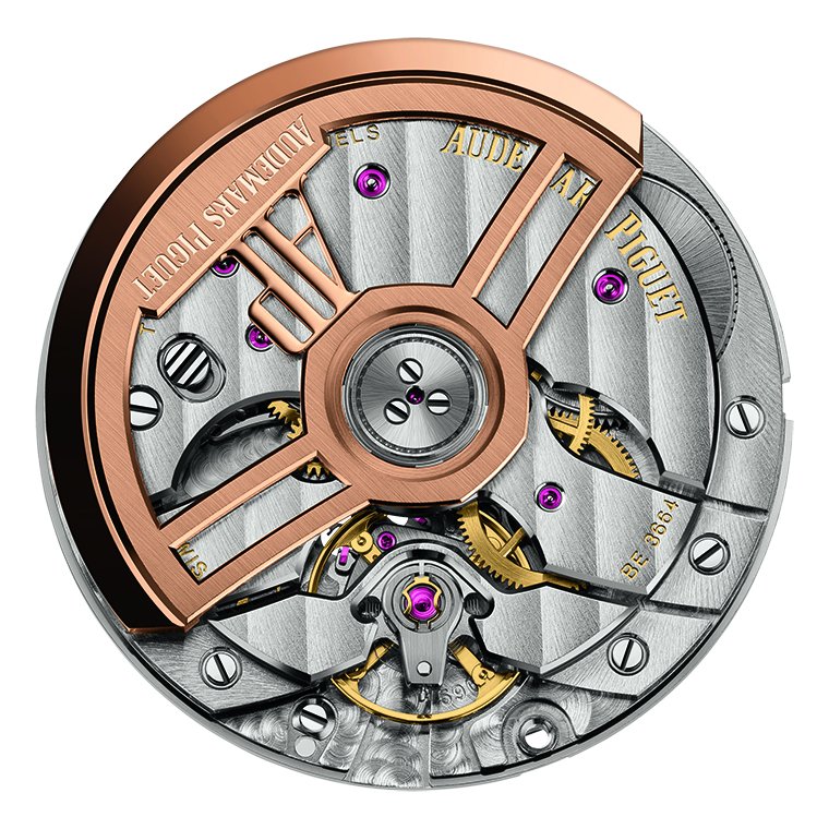 นาฬิการุ่น Royal Oak เรือนนี้มาพร้อมคาลิเบอร์ 5900 ที่มีกลไกอัตโนมัติในการนับชั่วโมง นาที วินาที และบอกวันที่ซึ่งAudemars Piguet ได้พัฒนาขึ้นเป็นครั้งแรกในปี 2022 ในรุ่นขนาดหน้าปัด 37 มิลลิเมตร บางรุ่น คาลิเบอร์ 5900 นี้มีความหนาเพียง 3.9 มิลลิเมตร มีความถี่ของ balance wheel ที่ 4Hz และสามารถสำรองพลังงานได้ยาวนาน 60 ชั่วโมง สามารถมองเห็นกลไกต่าง ๆ ได้ผ่านฝาหลังประดับแซฟไฟร์ที่จะเผยให้เห็น oscillating weight พิ้งค์โกลด์ 22 กะรัต ตลอดจนรายละเอียดของเทคนิคการตกแต่งอย่างประณีตบนชิ้นส่วนต่าง ๆ เช่น การขัดเงาที่มุมต่าง ๆ การขัดแบบซาตินในแนวตั้ง การใช้เทคนิคการตกแต่ง “โกตส์ เดอ เฌอแนฟ” (Côtes de Genève) เทคนิค “เซอร์คิวลาร์ เกรนิง” และการขัดเงาลบมุม