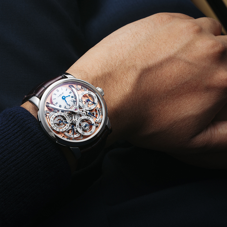 การใช้ระบบนวัตกรรมซึ่งพัฒนาขึ้นเฉพาะสำหรับ Legacy Machine Perpetual นี้ ทำให้หน้าปัดย่อยต่างๆ ปรากฏเสมือน“ลอย” อยู่เหนือกลไกด้วยการเชื่อมต่อที่มองไม่เห็น โดยหน้าปัดย่อยแบบสเกเลตัน (skeletonised) เหล่านี้ได้จัดวางบนปุ่มสตั๊ดซึ่งซ่อนอยู่ และไม่อาจเกิดขึ้นได้ในทางเทคนิคสำหรับจักรกลปฏิทินถาวรตามแบบประเพณีทั่วไป ด้วยเพราะจะไปกั้นการเคลื่อนไหวของเลเวอร์ขนาดใหญ่ (grand levier) นั่นเอง
