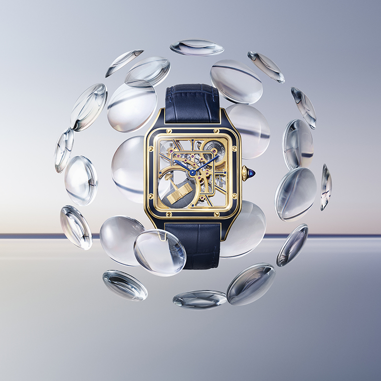 ผลงานเชิงสุนทรียะและเทคนิคที่ทำขึ้นเพื่อคารวะอัลแบร์โต ซานโตสดูมงต์ชิ้นนี้เป็นความสำเร็จที่ไม่ยิ่งหย่อนไปกว่าที่นักบินผู้ยิ่งใหญ่เคยจารึกไว้ ซานโตสดูมงต์เป็นบุรุษที่ตั้งเป้าสูงกว่าเดิมเสมอ เขาออกแบบอากาศยานกว่า 22 ลำ จดสิทธิบัตรสิ่งประดิษฐ์ชิ้นแล้วชิ้นเล่าทั้งยังเสี่ยงชีวิตทุกครั้งที่นำเครื่องขึ้นทดลองบิน สำหรับกลไกไมโคร-โรเตอร์ (micro-rotor) แบบใหม่เป็นผลงานที่ Cartier Manufacture ที่ La Chaux-de-Fonds (ลา โช เดอ ฟง) โดยใช้เวลาพัฒนาเกือบ 2 ปี และนำมาประกอบชิ้นส่วนขึ้นทั้งหมด 212 ชิ้น เรือนเวลา Santos-Dumont กลไกสเกเลตัน ในแบบตัวเรือนโรสโกลด์และตัวเรือนสตีล ยกระดับความภูมิฐานขึ้นอีกขั้น และยังมีรุ่นลิมิเต็ด ตัวเรือนเยลโลว์โกลด์เคลือบแลคเกอร์สีกรมท่า ที่รายละเอียดทุกส่วน รวมถึงขอบหน้าปัดและตัวเรือนล้วนเคลือบแลคเกอร์ โดยสะพานจักรแบบสเกเลตันนั้นเคลือบแลคเกอร์ด้วยมืออย่างประณีต