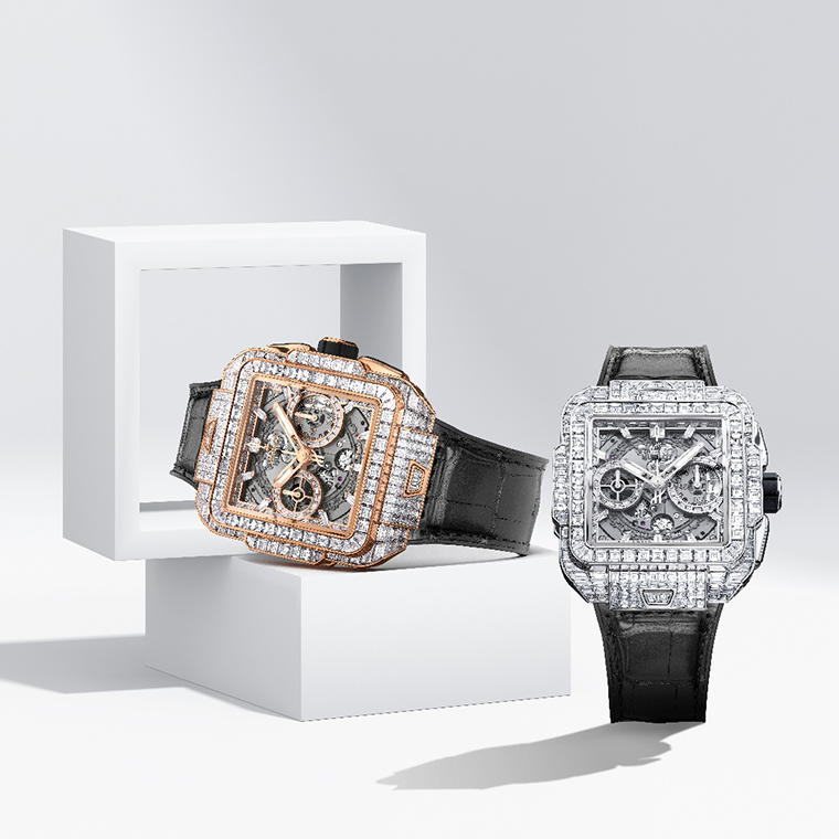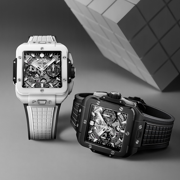 ในปี 2022 ทาง Hublot ได้เผยโฉมตัวเรือนดีไซน์รูปทรงสี่เหลี่ยมใหม่ในรุ่น Square Bang Unico หลังจากหนึ่งปีแห่งความสำเร็จของรุ่นดังกล่าว ทาง Hublot ได้นำเสนอสามรุ่นใหม่ในตัวเรือนแซฟไฟร์และเซรามิก ซึ่งแสดงให้เห็นถึงความเชี่ยวชาญชำนาญงานพิเศษของแบรนด์ในการผลิตวัสดุที่ล้ำสมัยเหล่านี้