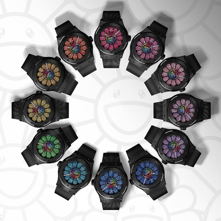 Hublot และ Takashi Murakami ยกระดับนาฬิกาในฐานะงานศิลป์ด้วยการเชื่อมโยงศิลปะแห่งการผลิตนาฬิกาชั้นเลิศเข้ากับศิลปะดิจิทัล ด้วยรูปแบบนาฬิกาที่มีเพียงหนึ่งเดียว 12 เรือน โดยแต่ละเรือนได้รับแรงบันดาลใจมาจากกลีบดอกไม้กลีบหนึ่งของ Classic Fusion Takashi Murakami Black Ceramic Rainbow ที่เปิดตัวเมื่อเดือนกุมภาพันธ์ที่ผ่านมา นาฬิกาทั้ง 12 เรือน ที่ไม่เหมือนใครมีการใช้สีหนึ่งของนาฬิกาเรือนที่ 13 ซึ่งประดับตกแต่งด้วยทับทิม แซฟไฟร์ อเมทิสต์ ทัสโวไรต์ หรือบุษราคัม เริ่มจำหน่ายในวันที่ 29 มีนาคม 2023 เวลา 14.00 น. ในกรุงเจนีวา โดยจะเปิดโอกาสให้นักสะสมที่สนใจนาฬิกาเรือนใดเรือนหนึ่งจาก 12 เรือนสามารถสะสมหนึ่งใน NFT ที่อยู่บน OpenSea ได้ โดยผู้ซื้อแต่ละรายที่โชคดีที่ได้ซื้อนาฬิกาใหม่ที่ไม่ซ้ำกัน 12 เรือนนี้จะได้รับ NFT สุดพิเศษที่สอดคล้องกันกับนาฬิกาเรือนนั้นๆ