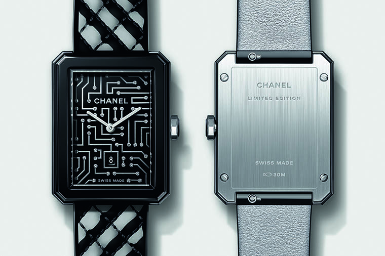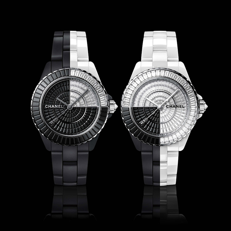 สองผลงานสร้างสรรค์สุดพิเศษที่จับคู่ระหว่างกราฟิกสีดำกับสีขาว พร้อมขับเน้นด้วยไวท์โกลด์และเพชร เส้นสายที่เรียบง่ายสะอาดตาซ่อนไว้ซึ่งความซับซ้อนทางเทคนิคและทักษะชำนาญการของศูนย์ผลิตนาฬิกาของชาเนลที่ไม่มีใครเทียบชั้นได้ ตัวเรือนเซรามิกความทนทานสูงทั้งสีขาวและสีดำด้านขนาดเส้นผ่านศูนย์กลาง: 38 มม. ประดับเพชรเจียระไนทรงบาแก็ตต์ 105 เม็ด (~3.52 กะรัต) และเพชรเจียระไนทรงบริลเลียนท์ 1 เม็ด (~0.16 กะรัต) เหนือเม็ดมะยม ด้านหลังตัวเรือนกระจกแซฟไฟร์พร้อมข้อความ “LIMITED TO 12” ขอบตัวเรือนไวท์โกลด์ 18K แบบคงที่ประดับเพชรเจียระไนทรงบาแก็ตต์ 12 เม็ด (~1.47 กะรัต) และวงแหวนเซรามิกทรงบาแก็ตต์สีดำ ส่วนอีกรุ่นประดับเพชรเจียระไนทรงบาแก็ตต์ 36 เม็ด (~4.40 กะรัต) และวงแหวนเซรามิกทรงบาแก็ตต์สีดำ หน้าปัดไวท์โกลด์ 18K ประดับเพชรเจียระไนทรงบาแก็ตต์ 41 เม็ด (~1.15 กะรัต) และวงแหวนเซรามิกทรงบาแก็ตต์สีดำ อีกรุ่นประดับเพชรเจียระไนทรงบาแก็ตต์ 124 เม็ด สายรัดข้อมือเซรามิกความทนทานสูงสีขาวและสีดำด้านและหัวล็อคไวท์โกลด์ 18K แบบพับสามทบ ทำงานด้วยกลไกอัตโนมัติ คาลิเบอร์ 12.1 ผ่านการรับรองความเที่ยงตรงจาก COSC พร้อมเคลือบสีดำ และโรเตอร์ประดับเพชรเจียระไนทรงบาแก็ตต์ 52 เม็ด (~0.90 กะรัต) พลังงานสำรอง 70 ชั่วโมง กันน้ำ 50 เมตร ผลิตจำกัดเพียงแบบละ 12 เรือน