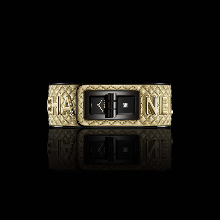 สายรัดข้อมือจากหนังลายควิลท์สีทอง เพิ่มความโดดเด่นสะดุดตาด้วยโลโก้ 6 ตัวอักษรที่สะกดเป็นคำว่า CHANEL หน้าปัดเคลือบแลคเกอร์ 2 หน้าปัด ด้านหนึ่งประดับเพชร