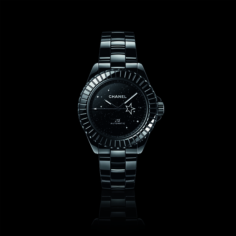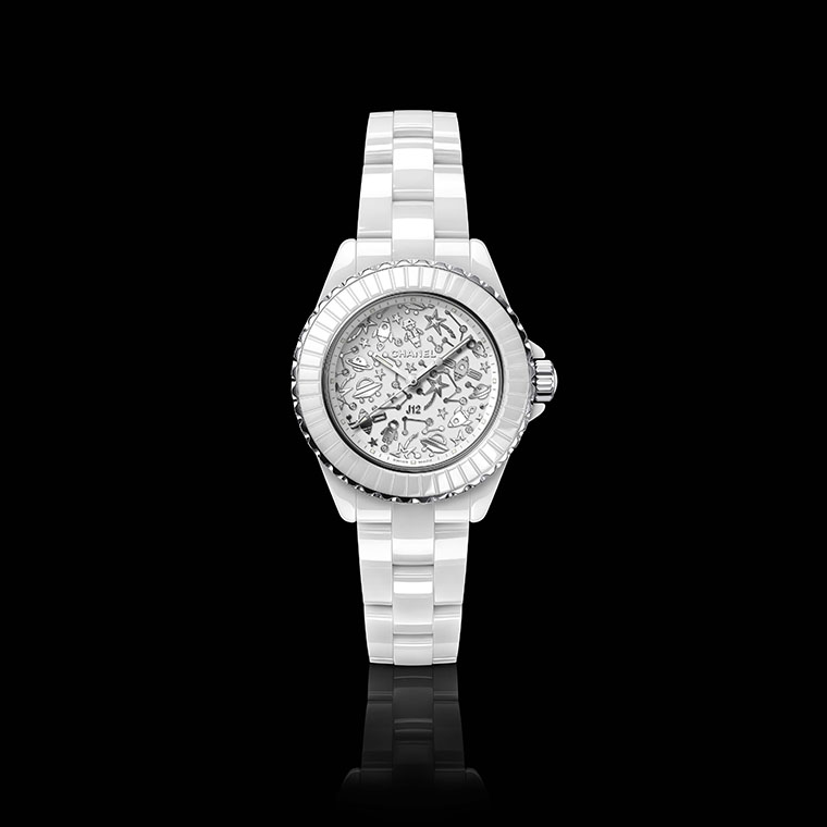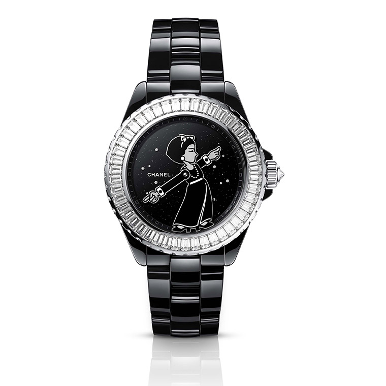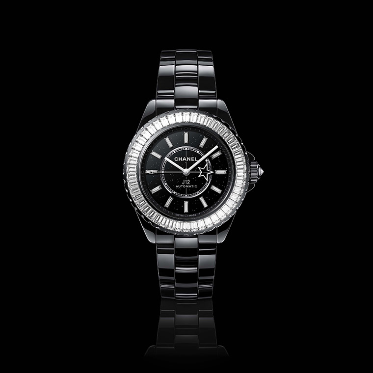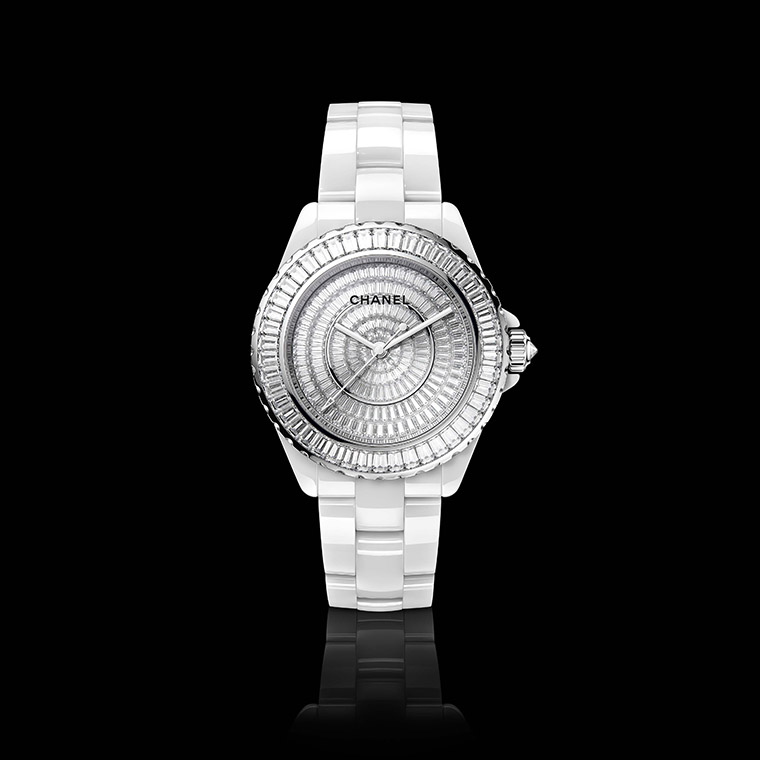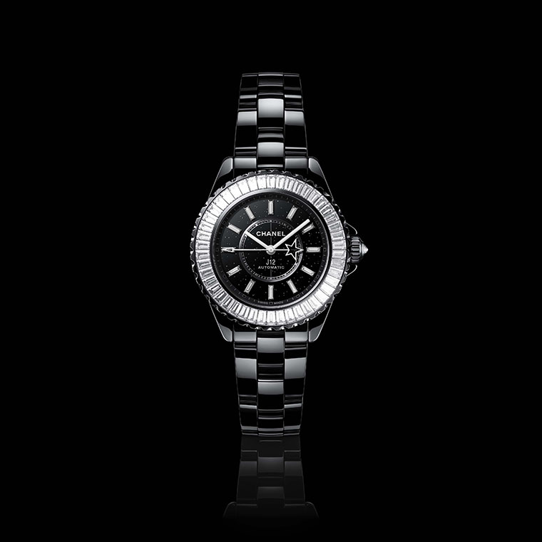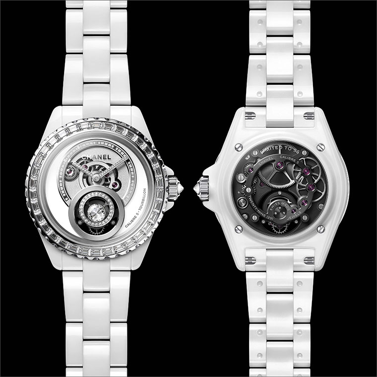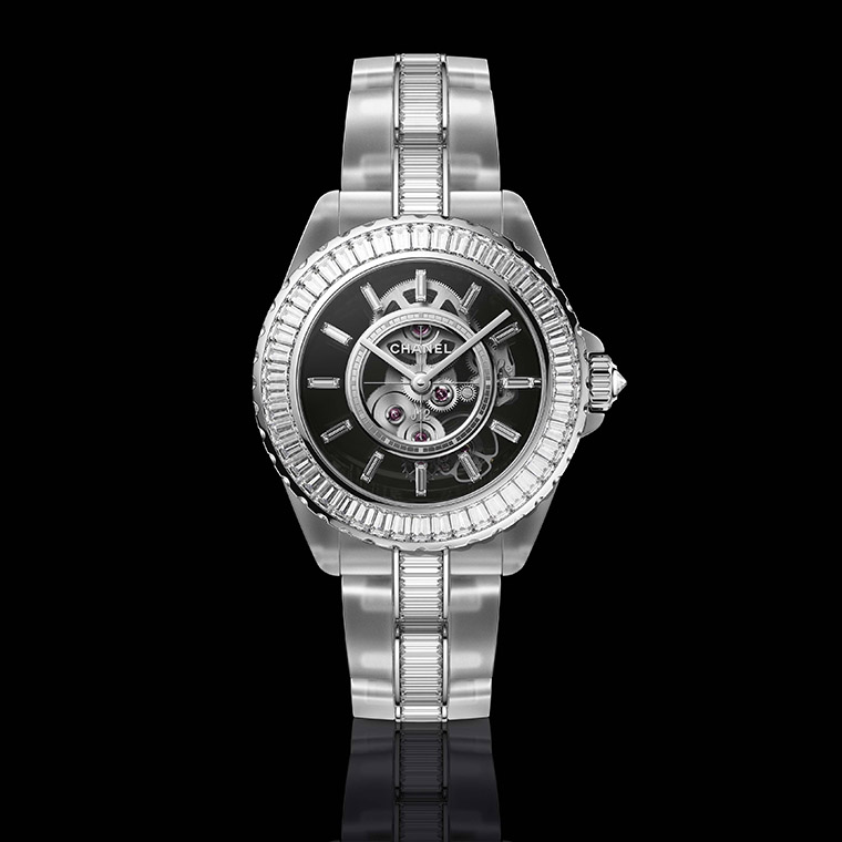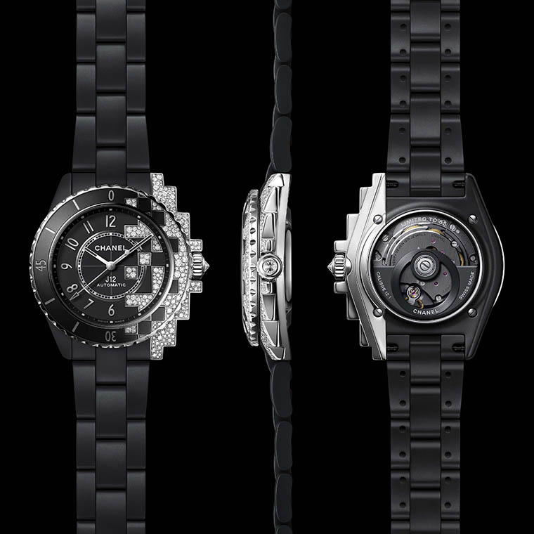 ตัวเรือนเซรามิกความทนทานสูงสีดำและไวท์โกลด์ 18K ขนาด 38 มม. ประดับเพชรเจียระไนทรงบาแก็ตต์ 46 เม็ด (~5.46 กะรัต) ด้านหลังตัวเรือนกระจกแซฟไฟร์พร้อมข้อความ “MADEMOISELLE J12” และ “LIMITED TO 55” ขอบตัวเรือนไวท์โกลด์ 18K แบบคงที่ประดับเพชรเจียระไนทรงบาแก็ตต์ 46 เม็ด (~5.46 กะรัต) หน้าปัดสีดำแวววาวประดับเพชรเจียระไนทรงบริลเลียนท์ 10 เม็ด (~0.02 กะรัต) และหุ่นจำลองขนาดเล็กของมาดมัวแซล เม็ดมะยมไวท์โกลด์ 18K แบบไม่ขันเกลียว ประดับเพชรเจียระไนทรงบริลเลียนท์ 1 เม็ด (~0.16 กะรัต) สายรัดข้อมือเซรามิกความทนทานสูงสีดำและหัวล็อคไวท์โกลด์ 18K แบบพับสามทบ ทำงานด้วยกลไกอัตโนมัติ คาลิเบอร์ 12.1 ผ่านการรับรองความเที่ยงตรงจาก COSC พร้อมเคลือบสีดำ พลังงานสำรอง 70 ชั่วโมง จำกัดเพียงรุ่นละ 55 เรือน