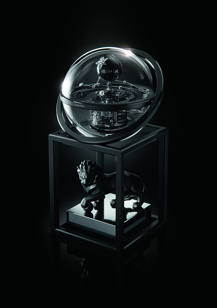 The Lion Astroclock คือผลงานสร้างสรรค์สุดพิเศษที่ได้รับแรงบันดาลใจจากสัญลักษณ์รูปดาวประจำราศีสิงห์ของ กาเบรียล ชาเนล ลูกโลกที่ทำจากกระจกนี้รังสรรค์ขึ้นอย่างซับซ้อนและห่อหุ้มการเคลื่อนไหวที่ประกอบด้วยดาวหางไวท์โกลด์ 18K และเข็มนาฬิการูปกลุ่มดาวประดับเพชร ฐานด้านล่างของลูกโลกมีสิงโตสีดำซึ่งเป็นสัญลักษณ์ของพลังและความแข็งแกร่งประดับอยู่ นาฬิกาอันน่าทึ่งนี้รวมสัญลักษณ์ของแบรนด์ชาเนลเอาไว้ และเป็นรุ่นลิมิเต็ด เอดิชั่นเพียง 5 เรือน