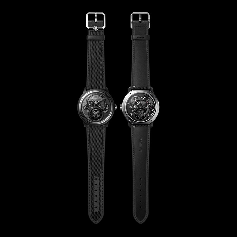 ขอบเซรามิกสีดำล้อมรอบตัวเรือนและขับเน้น 2 องค์ประกอบที่เป็นเอกลักษณ์ของนาฬิกาเรือนนี้ สิงโตซึ่งเป็นสัญลักษณ์ของ Chanel นั่งอยู่ภายในกรงทูร์บิญองและเคลื่อนไหวไปตามจังหวะของเข็มวินาที หน้าปัดที่รังสรรค์จากส่วนหนึ่งของหินอุกกาบาต ทำให้แต่ละชิ้นมีเอกลักษณ์เฉพาะตัว นับเป็นครั้งแรกที่นาฬิกา MONSIEUR มาพร้อมกลไกฟลายอิ้งทูร์บิญอง Calibre 5.1 ซึ่งออกแบบและประกอบโดยศูนย์ผลิตของ Chanel