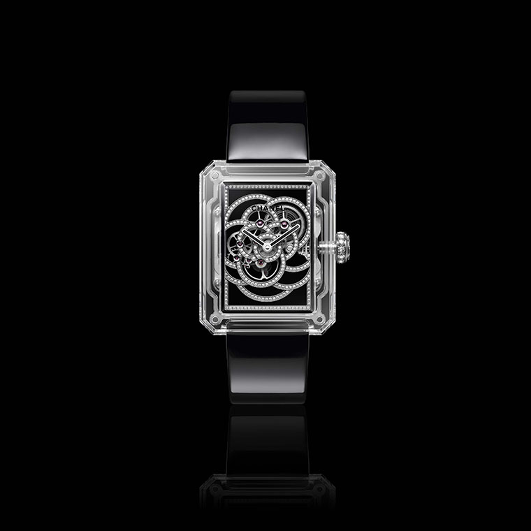 นาฬิกา Première Squelette Camélia เป็นการยกย่องดอกคามิลเลีย ซึ่งเป็นหนึ่งในสัญลักษณ์ที่เกี่ยวกับบทกวีมากที่สุดของแบรนด์ชาเนล กลไก Calibre 2 Haute Horlogerie ออกแบบและประกอบโดยศูนย์ผลิตของชาเนลช่วยขับเน้นรูปทรงเรขาคณิตของดอกไม้สามมิตินี้และอยู่ท่ามกลางแซฟไฟร์อันล้ำค่า