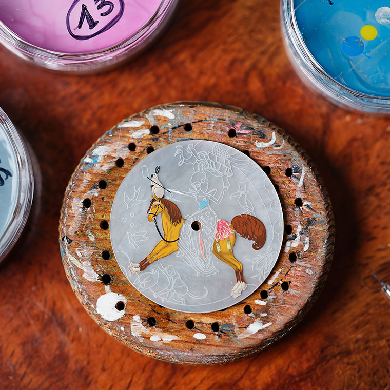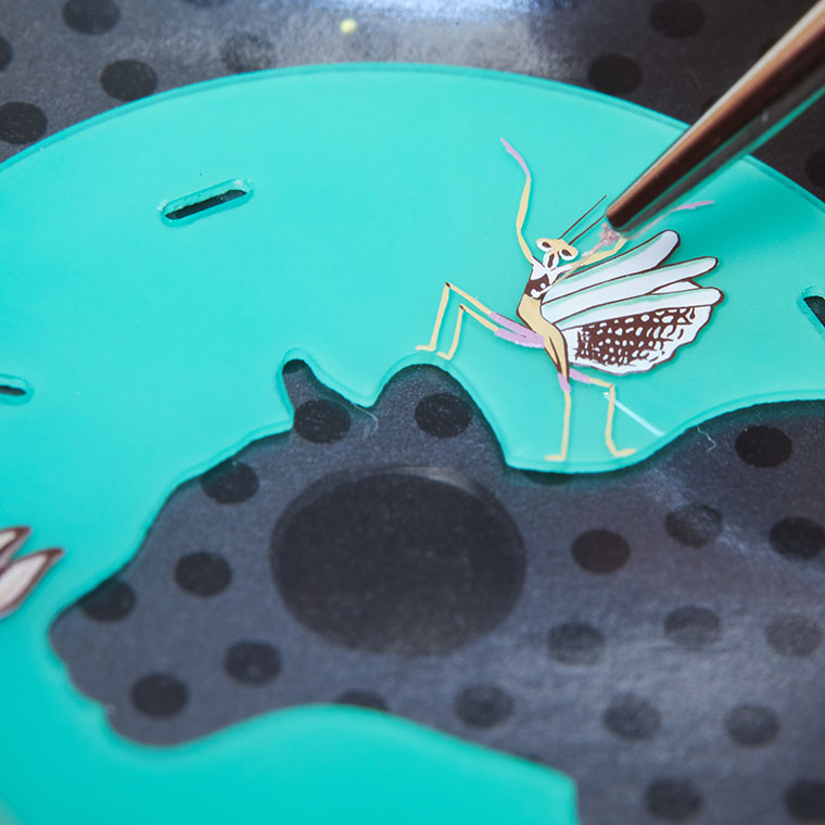 งานออกแบบนั้นเริ่มต้นจากการผลิตขึ้นใหม่ด้วยหมึกสีดำ ที่สามารถมองเห็นได้บนทั้งสองด้าน และเป็นการนำทางไปสู่สัมผัสอันเชี่ยวชาญของศิลปินจวบจนลายเส้นพู่กันสุดท้าย จากนั้นการตกแต่งทั้งหมดของลวดลายเหล่านี้จะถูกวาดขึ้นด้วยมือบนแผ่นชิ้นงานด้านแรก ด้วยเฉดสีพาสเทลหรือสีอ่อนที่ค่อยๆ บรรจงวาดลงทีละสี และด้วยความหนาพอสำหรับมอบมิติความลุ่มลึกให้กับงานออกแบบ ขณะเดียวกันก็บางพอที่จะปล่อยให้แสงส่องผ่านได้ เป็นความสมดุลอันลุ่มลึกละเอียดอ่อนที่ต้องอาศัยงานหัตถศิลป์อันเชี่ยวชาญและประณีตสูงสุด โดยใช้ประมาณ 20 ชั้นของการวาดสีเพื่อนำเอาทุกๆ มิติอันแตกต่างกันแม้เพียงเล็กน้อยของงานออกแบบนี้ให้เผยออกมา แต่ละชั้นยังต้องผ่านการเผาภายในเตาไฟที่อุณหภูมิ 90 องศาเซลเซียส เพื่อสร้างความแข็งแรงและทนทานให้กับเม็ดสีอันล้ำค่า จวบจนผลงานที่น่าอัศจรรย์ผ่านความชำนาญของช่างฝีมือและความคิดสร้างสรรค์ของนักออกแบบเกิดเป็นเรือนเวลาซึ่งมอบศิลปะแห่งโลกการ์ตูนให้แก่ผู้สวมใส่