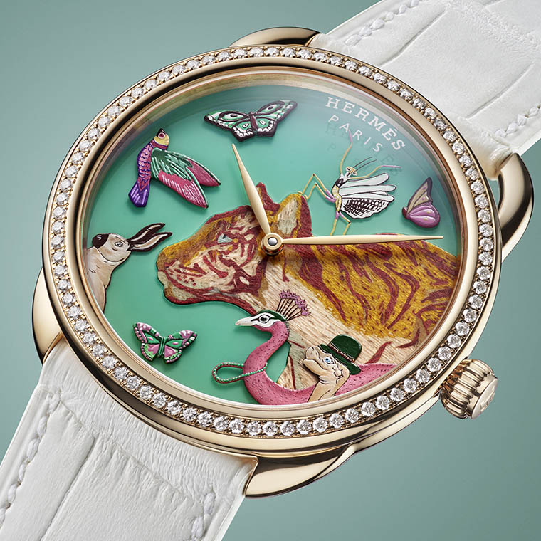 การบุกเบิกสร้างสรรค์อันยิ่งใหญ่นี้ได้หวนคืนกลับสู่ฉากแห่งความวิเศษเหนือจินตนาการของการประดิษฐ์นาฬิกาครั้งใหม่ โดยผ่านผลงาน Arceau Hermès story ที่เล่นกับเวลาและการก้าวอยู่เหนือแฟชั่นที่โลกแห่งดิจิทัลทั้งหมดได้ล้วนแสดงออกผ่านทักษะเชิงศิลป์อันเก่าแก่ ที่ซึ่งสิ่วสลักและปากกาตัดไม้ได้ครองอำนาจสูงสุด รวมถึงมวลมิติของทองที่สลักรูปด้วยมืออย่างประณีต เรือนเวลา Arceau Hermès story ได้ถ่ายทอดภาพความโดดเด่นอันเป็นหัวใจของเหล่าสัตว์อันแสนวิเศษเหล่านี้ การสร้างสรรค์ผลงานศิลปะผ่านเสือที่ประกอบขึ้นจากงานต่อลายไม้ มอบความน่าอัศจรรย์ราวกับผลงานที่มีชีวิตพร้อมด้วยดวงตาเทอร์ควอยซ์นี้ได้ผสมผสานขึ้นจากไม้พลัม ทิวลิปวูด มะกอกเทา เมเปิ้ล และไซคามอร์หรือไม้ตระกูลมะเดื่อ รวมแล้วถึง 290 ชิ้นที่ถูกตัดอย่างพิถีพิถัน พร้อมทั้งย้อมสีและประกอบเข้าด้วยกันทีละชิ้นทีละชิ้น โดยเพียงเฉพาะเสือตัวเดียวนั้นจำเป็นต้องใช้เวลาถึงห้าวันของการทำงาน เพื่อมอบซึ่งความเสมือนจริงและความลุ่มลึกมีมิติของรายละเอียดทั้งหมด