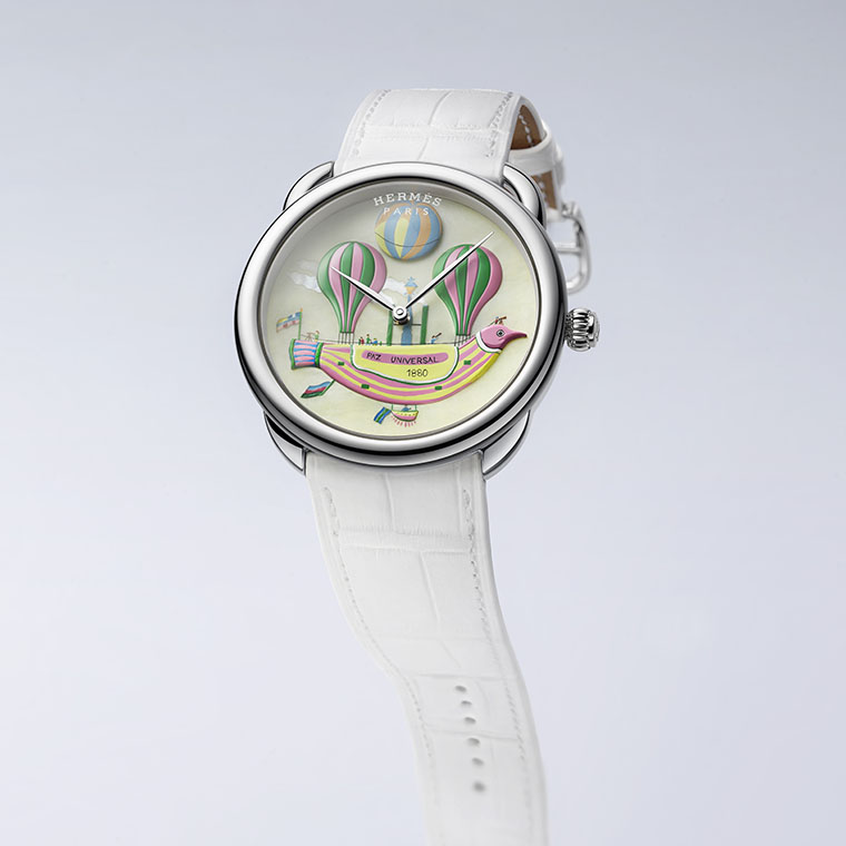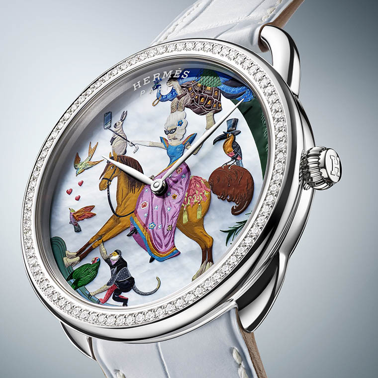 เรือนเวลา Arceau Hermès story ที่ถ่ายทอดผ่านการวาดภาพย่อส่วนบนเปลือกหอยมุก ผสมผสานหลากหลายขั้นตอนของการเคลือบเงา ขัดเงา และขัดเรียบด้วยมือ โดยการตกแต่งด้วยชั้นต่างๆ ถึง 20 ชั้นหรือมากกว่าระหว่างสีสันอันหลากหลาย ที่ออกแบบขึ้นเพื่อเผยเฉดสีที่แตกต่างกันแม้เพียงเล็กน้อย และมอบภาพของแสงสะท้อนอันแวววาวระยิบระยับสะกดสายตา จากการทำงานตลอดแปดวัน และตามมาด้วยขั้นตอนของการเผาภายในเตาอีกเล็กน้อย ที่กลวิเศษแห่งงานฝีมือนี้จึงได้เผยขึ้น ผ่านภาพของเจ้าหญิงที่ปรากฏโฉมบนม้าไม้ของเธอ ณ ใจกลางวงล้อมของเหล่าสัตว์ ที่ซึ่งทั้งนกทูแคน เต่า นกยูง นกนางแอ่นและกระต่าย ได้ครองจุดที่ดีที่สุดของฉากสำหรับการถ่ายภาพตนเอง ในบรรยากาศของชานเมืองอันเต็มเปี่ยมไปด้วยเรื่องราวแห่งความมีชีวิตชีวา