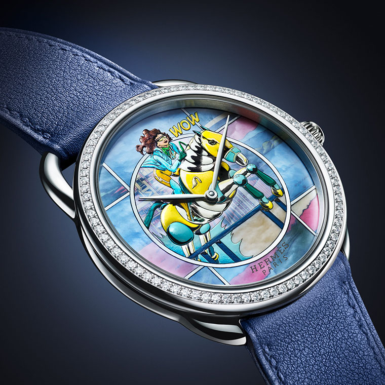 เรือนเวลา Wow นับเป็นการนำเอาจิตวิญญาณของนักขี่ม้าที่เป็นสัญลักษณ์ของ Hermès มารังสรรค์ผลงานศิลปะนำพาไปสู่โลกแห่งการ์ตูนได้อย่างน่าอัศจรรย์ นักออกแบบได้ถ่ายทอดท่าทางการกระโดดขึ้นบนอานม้า พร้อมกับการวางเท้าลงบนโกลน เพื่อนำเสนอภาพของรูปทรงสี่เหลี่ยมขนาดเล็กราวกับช่องภาพสไตล์หนังสือการ์ตูน ที่จัดวางไว้ภายในรูปทรงสี่เหลี่ยมขนาดใหญ่ของผ้าพันคอไหม ทั้งรูปทรงสี่เหลี่ยม ช่องคำพูด และการเคลื่อนไหว ที่เล่าเรื่องราวผ่านฉากของฮีโร่หญิงผู้เดินทางข้ามกรุงปารีสในชุดเจ็ตสกี รองเท้าสเก็ตบนรถ และแน่นอนว่ารวมไปถึงบนหลังม้าที่ปราฏนักกอล์ฟหญิงผู้มีอารมณ์ขัน