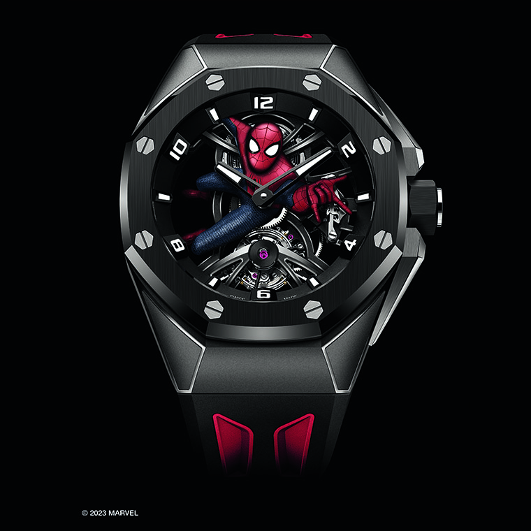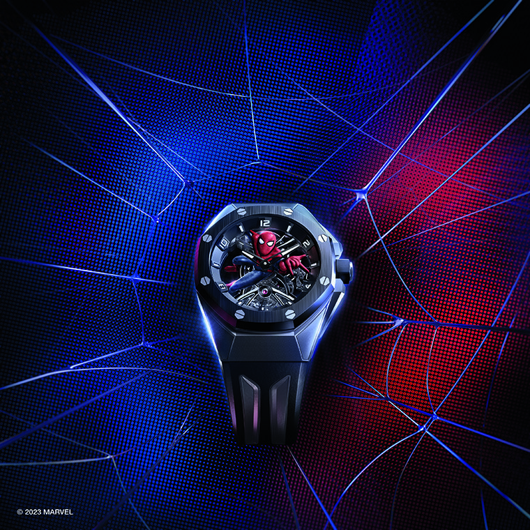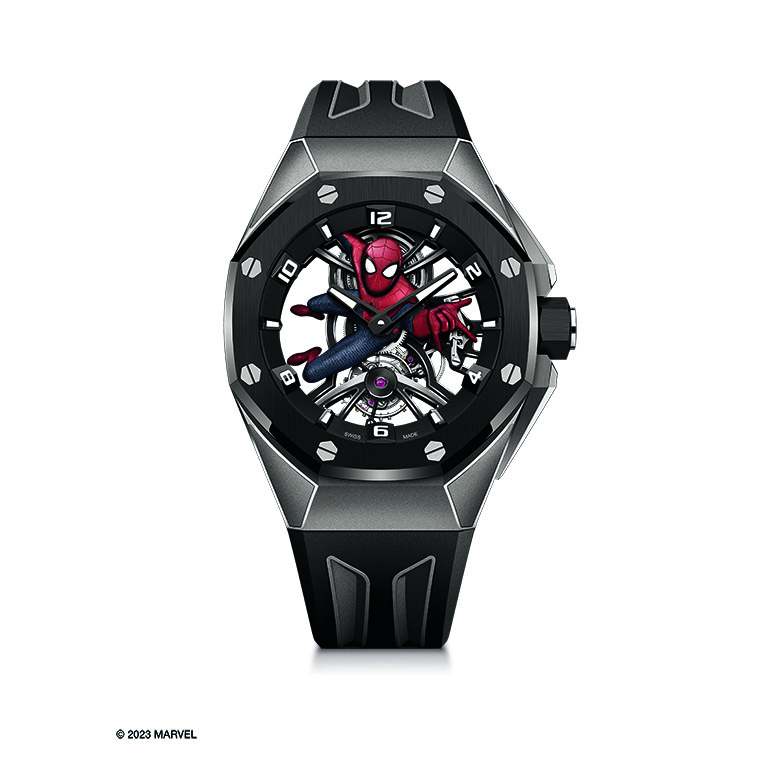 หลังการเปิดตัวนาฬิการุ่น Royal Oak Concept “Black Panther Flying Tourbillon ในปี 2021 Audemars Piguet เผยความร่วมมือกับมาร์เวลเป็นครั้งที่สองผ่านตัวละคร Spider-Man หนึ่งในตัวละครซูเปอร์ฮีโร่ที่ได้รับความนิยมสูงที่สุดของมาร์เวล ในจักรวาลมาร์เวลนั้น สไปเดอร์แมนถือเป็นตัวแทนของการเปลี่ยนแปลง และเป็นซูเปอร์ฮีโร่ขวัญใจมหาชนทั่วโลก ด้วยคาแรกเตอร์เฉพาะตัวที่ส่งเสริมค่านิยมของครอบครัวและชุมชน สไปเดอร์แมนกลายเป็นปรากฏการณ์วัฒนธรรมป๊อปอย่างรวดเร็วหลังจากปรากฏตัวในหนังสือการ์ตูน วิดีโอเกม สินค้า อุปโภคบริโภคและอีกมากมาย หลังผ่านไป 60 ปีหลังจากการเปิดตัวครั้งแรก วันนี้ Audemars Piguet และมาร์เวลตื้นตันและยินดีเป็นอย่างยิ่งที่ได้ถ่ายทอดความพิเศษของไอคอนในวัฒนธรรมป๊อปผู้น่าทึ่งนี้ให้ทุกคนได้ประจักษ์