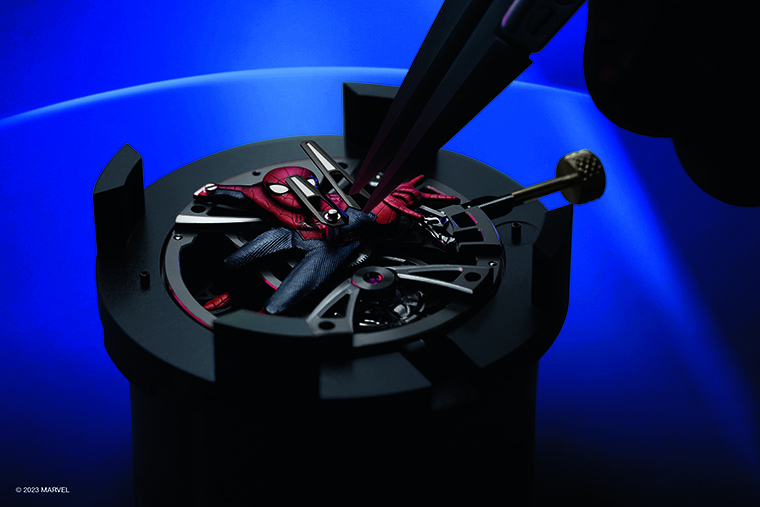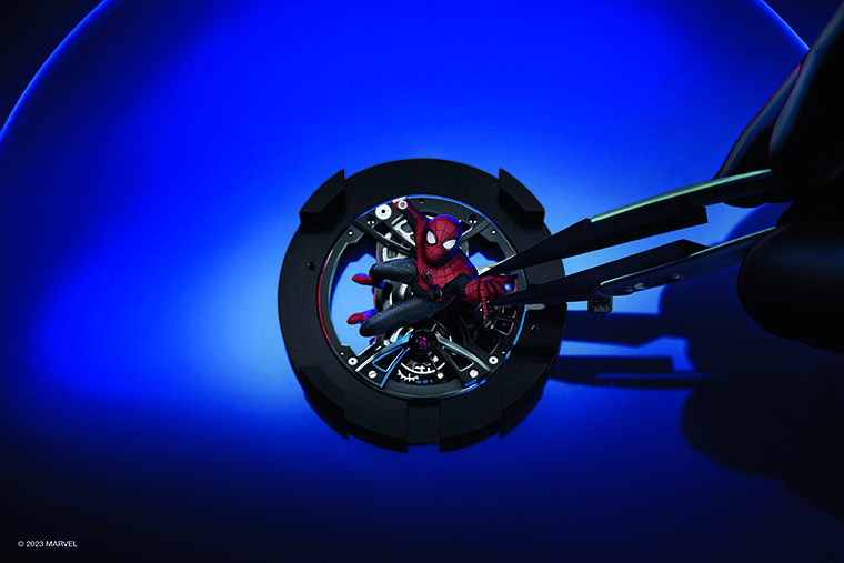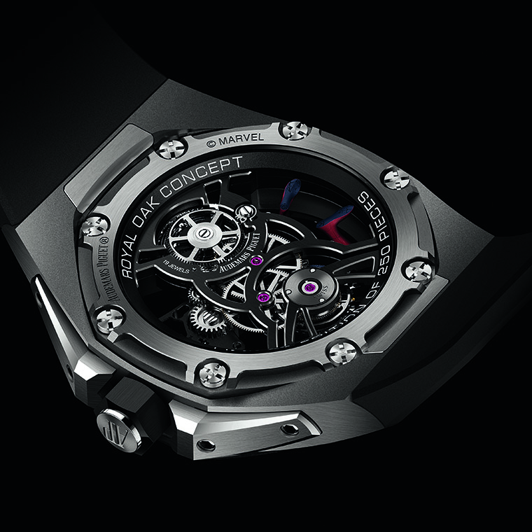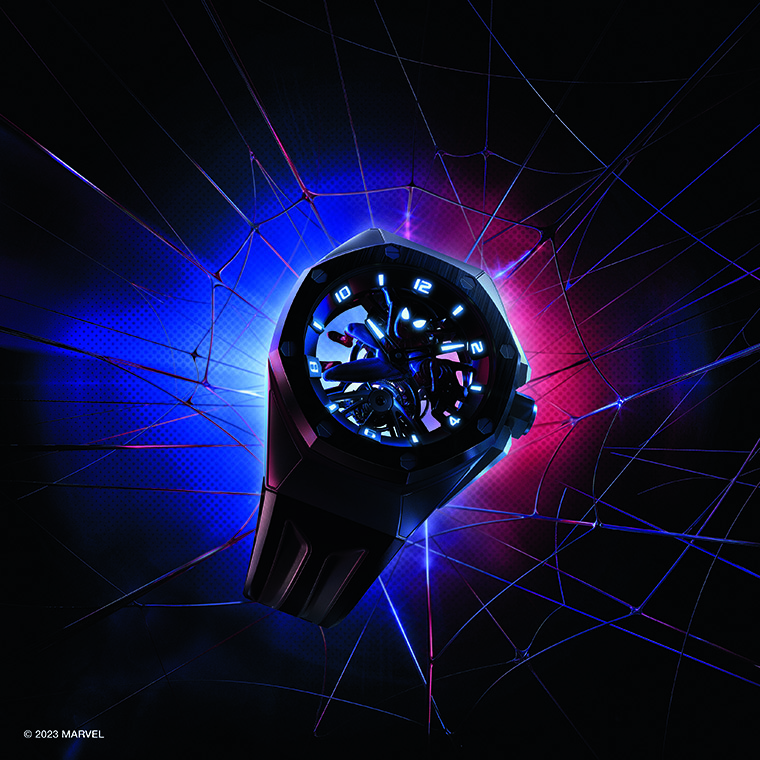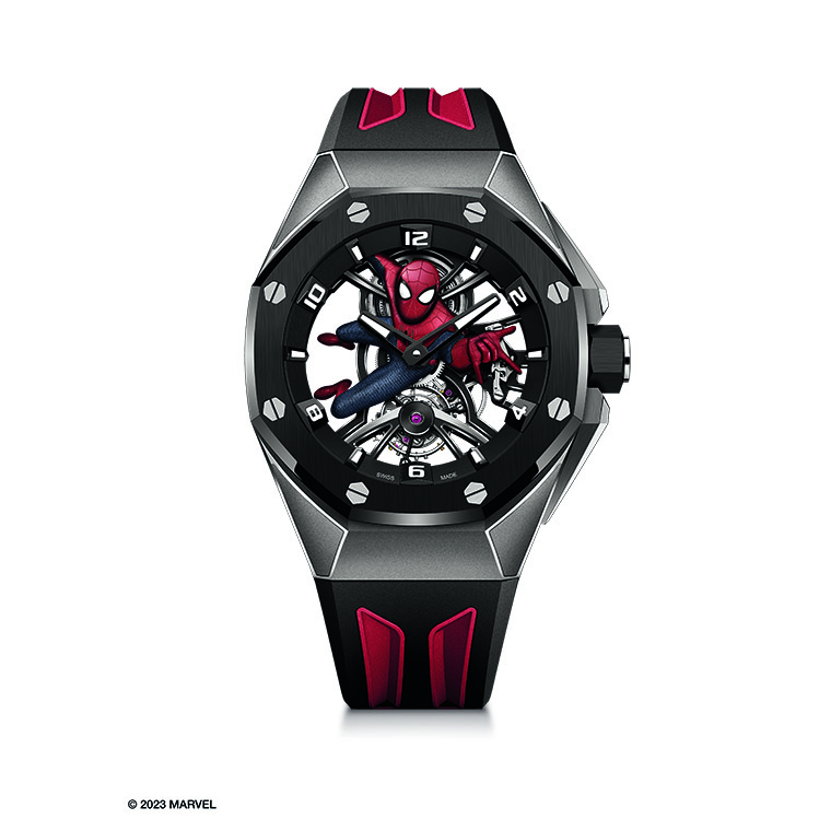 Royal Oak Concept Tourbillon “Spider-Man” เผยความโดดเด่นของงานฉลุแบบ openwork ผ่านตัวละครซูเปอร์ฮีโร่ผู้ยิ่งใหญ่ของมาร์เวลทั้งบนหน้าปัดและในรายละเอียดที่มองเห็นผ่านฝาหลัง