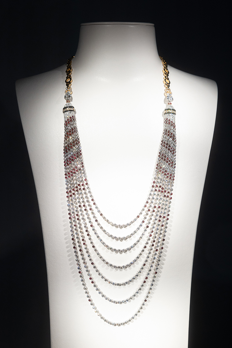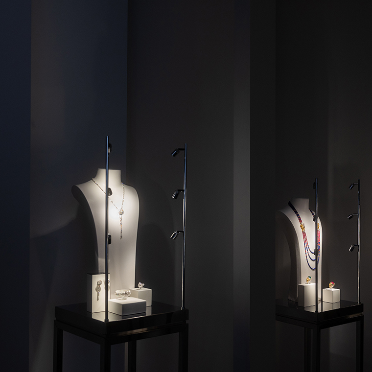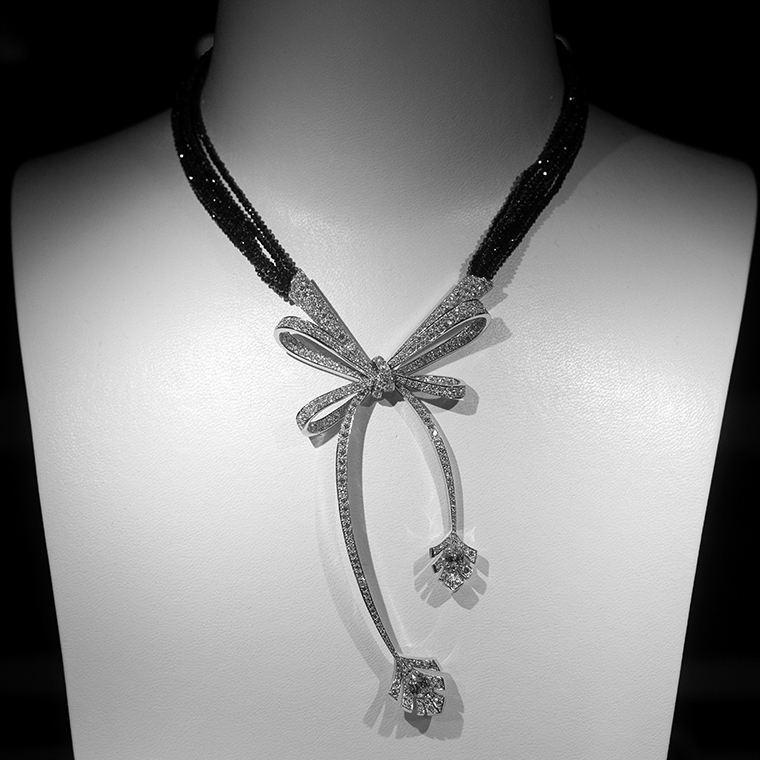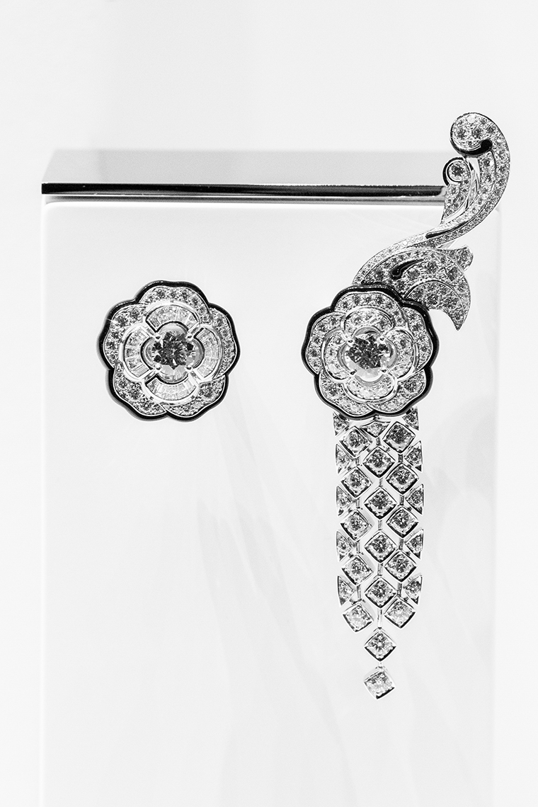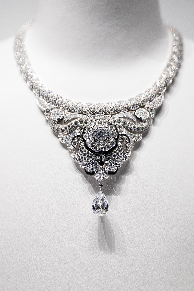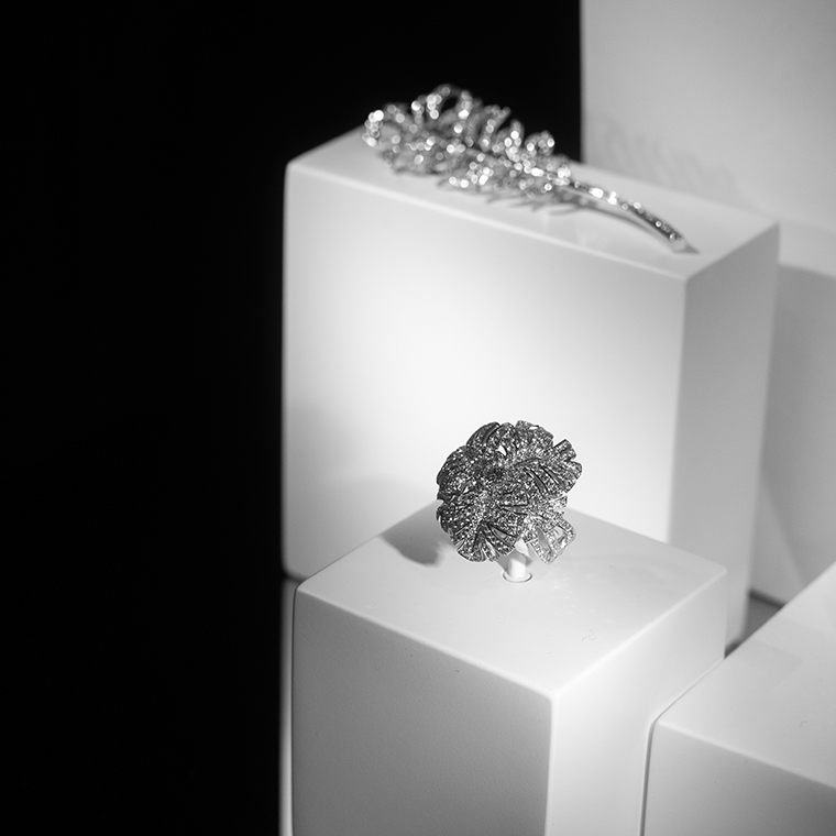 ภายในอาคารจำลองสีขาวสะดุดตาภายในห้องบอลรูมของโรงแรม นำเสนอเครื่องประดับชั้นสูงกว่า 80 ชิ้นที่ได้รับการรังสรรค์ขึ้นมาใหม่ สืบสานเรื่องราวของเครื่องประดับชั้นสูงคอลเลกชั่นแรกจากสตูดิโอสร้างสรรค์ของ Chanel ในปี 1932 โดยมีผลงานใหม่จากคอลเลกชั่น Bijoux de Diamants ในธีมของดาวหาง ริบบิ้น และขนนก รวมถึงเครื่องประดับที่ได้แรงบันดาลใจจากไลฟ์สไตล์ของ กาเบรียล ชาเนล ไม่ว่าจะเป็นราศีสิงห์ ราศีเกิดของเธอ การเดินทางท่องเที่ยว ผลงานแต่ละชิ้นรังสรรค์จากอัญมณีล้ำค่ามากมาย โดยเฉพาะสร้อยคอที่มีเพียงหนึ่งเดียวในโลกเท่านั้น เป็นสร้อยคอประดับเพชรที่ตัดขอบดอกคามีเลียด้วยแลกเกอร์สีดำ มูลค่าราว 129 ล้านบาท สวยสะดุดตาอย่างแท้จริง