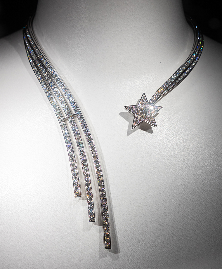 คืนหนึ่งในฤดูร้อนในกรุงปารีส อากาศยังคงร้อนอบอ้าวและท้องฟ้าสีเทาอันกว้างใหญ่ก็เต็มไปด้วยฝนดาวตก ผืนผ้าใบสีดำสนิทที่ส่องสว่างด้วยรัศมีของพระจันทร์เสี้ยว ดวงดาวอันงดงามที่เปล่งประกายดุจเพชรที่ลอยคว้างอยู่เหล่านี้กำลังจะสร้างเหตุการณ์ที่เป็นแรงบันดาลใจ อันนำมาสู่รากฐานในการรังสรรค์เครื่องประดับชั้นสูงของชาเนลทั้งหมด ระหว่างที่เธอแหงนมองดวงดาวที่สุกสกาวบนแผ่นฟ้าอันยิ่งใหญ่นั้น มาดมัวแซลก็ตัดสินใจว่าเธอจะเสกสรรค์ฝนดาวตก พระจันทร์เสี้ยวที่ส่องสว่าง และดวงอาทิตย์ที่กำลังลุกโชน ให้โปรยปรายบนผิวกายและผมของผู้หญิง การรังสรรค์ "Bijoux de Diamants" จึงเป็นบทสรุปของความรักที่เธอมีต่อความงดงามและชีวิตที่เปล่งประกายโชติช่วงจนไม่อาจต้านทานได้