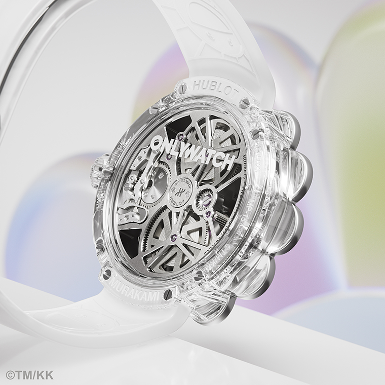 ทว่า ยังไม่หมดเพียงเท่านี้ เพื่อสะท้อนถึงจักรวาลของ Murakami อย่างแท้จริง ภายใต้กระจกแซฟไฟร์โค้งแบบโดมของนาฬิกา MP-15 Only Watch เรือนนี้ยังเผยให้เห็นการแกะสลักด้วยเลเซอร์อันประณีตที่ถ่ายทอดภาพของรอยยิ้มกว้างและเติมเต็มความสมบูรณ์ด้วยดวงตาที่ยิ้มแย้มทั้งสองดวง ผลงานอันเปี่ยมด้วยสีสันนี้ได้มอบซึ่งการเข้าถึงสู่จินตนาการอันมีชีวิตชีวาของ Takashi Murakami โดยพลังอันสว่างสดใสของนาฬิกานี้ก็เปรียบเหมือนดั่งบทกวีสู่ความมหัศจรรย์ของเด็กๆ อันน่าทึ่ง และความอยากรู้อยากเห็นอย่างไม่มีที่สิ้นสุดของพวกเขา