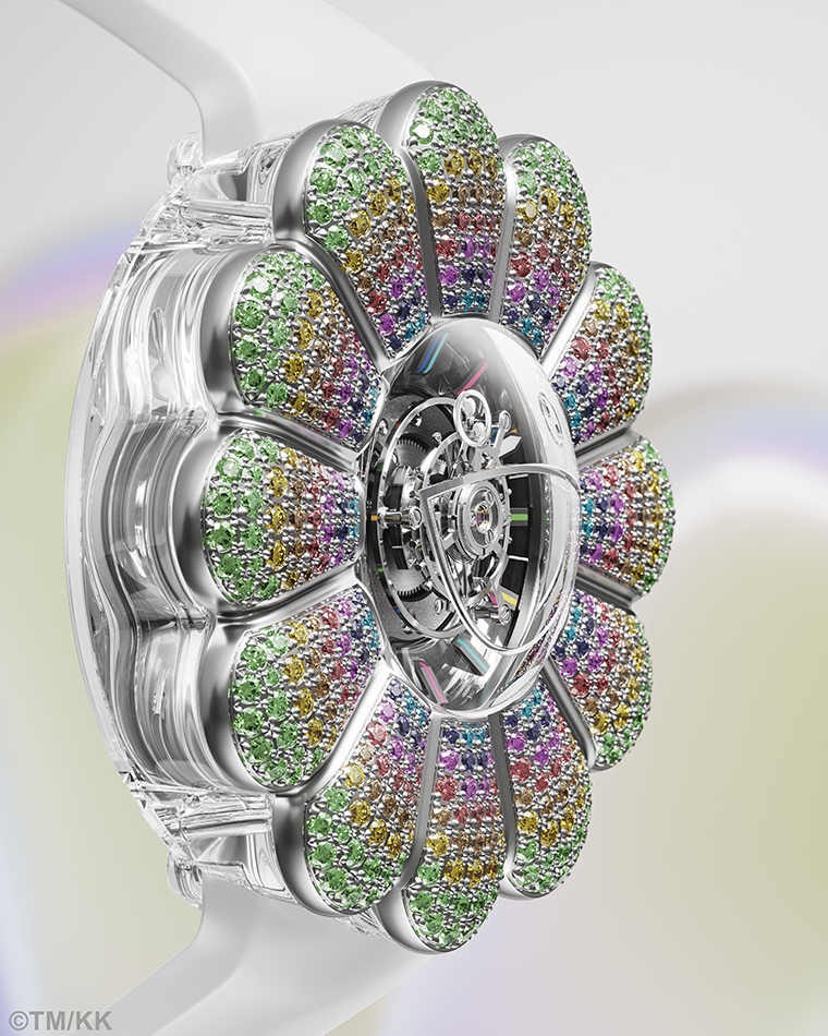 จากกรงทูร์บิญอง เครื่องหมายบอกเวลา ตลอดไปจนถึงกลีบดอกไม้ แฟนๆ ผู้หลงใหลในกวีแห่งสีสันของ Takashi Murakami จะได้ชื่นชมเสน่ห์นี้กับผลงาน MP-15 จากภายในจรดภายนอก กลีบดอกไม้ทั้ง 12 กลีบล้วนได้รับการประดับตกแต่งอย่างเต็มเปี่ยมไปด้วยอัญมณีล้ำค่าถึง 444 เม็ด มอบซึ่งความสดใสและสุนทรียะแห่งความสนุกสนาน เฉกเช่นดอกไม้จริง กลีบดอกเหล่านี้ได้ถูกจัดวางด้วยมุมเอียงเข้าสู่ศูนย์กลางของกลไก ขณะที่การใช้สีที่ชัดเจนและโดดเด่นนั้นยังเป็นตัวแทนของ Only Watch 2023 ซึ่งแนวคิดนี้ไม่เพียงมอบซึ่งมิติของการไล่เฉดสีรุ้งแบบทั่วไป แต่ยังเป็นการเล่นกับความสว่างของเฉดสีและความแวววาวเป็นประกายของอัญมณี เหมือนกับเด็กที่กำลังเล่นดินสอสี สร้างสรรค์เป็นชิ้นงานอันสดใสของศิลปะร่วมสมัย (Superflat Art) บนข้อมือ