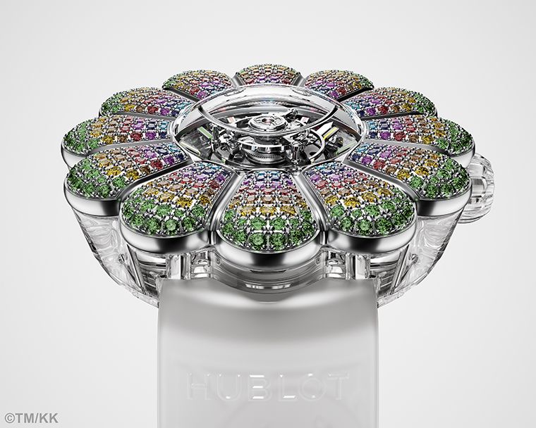 องค์ประกอบของดอกไม้คือศูนย์กลางผลงานสร้างสรรค์ของ Takashi Murakami ศิลปินชาวญี่ปุ่นคนนี้ได้สร้างชื่อเสียงจากจุด เริ่มต้นจนกลายมาสู่การเป็นหนึ่งในศิลปินอันเป็นที่ต้องการสูงสุดของโลก และเขาได้ร่วมเป็น Friend of Hublot (เฟรนด์ ออฟ อูโบลท์) นับตั้งแต่ปี ค.ศ. 2020 โดยหลากหลายผลงานสร้างสรรค์แห่งความร่วมมือกันนี้ล้วนผลิตขึ้นในซีรีส์จำนวนจำกัด โดย เฉพาะนาฬิการุ่นใหม่นี้ที่จำกัดยิ่งกว่า เพราะมีเพียงหนึ่งเดียวเท่านั้น นอกจากเอกลักษณ์เพียงหนึ่งเดียวโดยธรรมชาติแล้ว(สร้างสรรค์ ขึ้นเพียงเรือนเดียวเท่านั้น) ยังมีความโดดเด่นของโครงสร้างตัวเรือน ซึ่งสิ่งที่ทำให้ MP-15 (เอ็มพี-15) นั้นแตกต่างไปจาก ผลงานอื่นๆ ที่โรงงานการผลิตแห่งนี้ได้เคยสร้างสรรค์มาตลอดระยะเวลากว่า 40 ปี นั่นก็คือ การบรรจุด้วยกลไกทูร์บิญองกลาง หรือ Central Tourbillon นั่นเอง