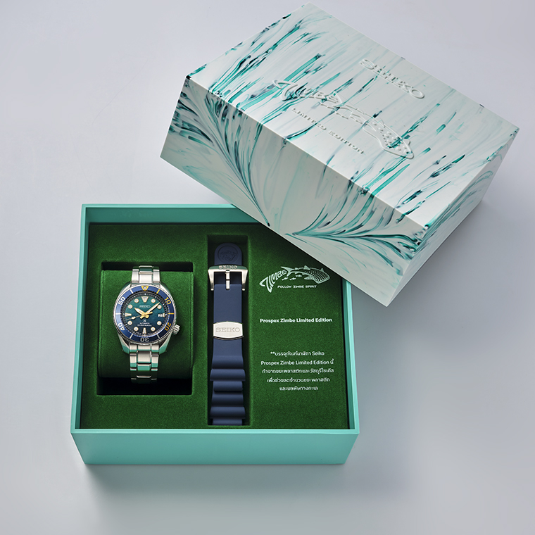 Seiko Prospex Zimbe Limited Edition No. 18 รหัส SPB425J ผลิตจำนวนจำกัดเพียง 1,500 เรือน จัดจำหน่ายเฉพาะประเทศไทยเท่านั้น สนนราคาที่ 42,800 บาท บรรจุในกล่องดีไซน์พิเศษผลิตจากพลาสติกรีไซเคิลเพื่อหวังลดขยะพลาสติกหนึ่งในมลพิษสิ่งที่สร้างมลภาวะให้กับระบบนิเวศน์ของท้องทะเล และมหาสมุทร