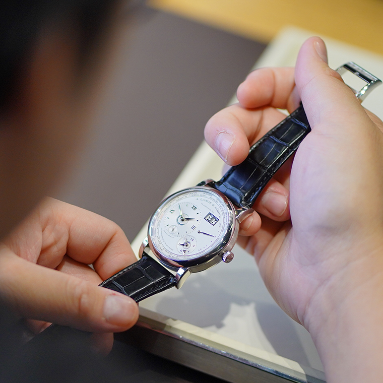 ส่วน Lange 1 Time Zone นาฬิกาอีกหนึ่งเรือนที่ในปีนี้ ได้เผยโฉมในรุ่นใหม่พร้อมตัวเรือนที่ผลิตจากแพลทินัม 950 ขนาด 41.9 มิลลิเมตร จับคู่กับพื้นหน้าปัดสีโรเดียม โทนสีโมโนโครมช่วยเพิ่มความสง่างามเหนือกาลเวลาให้กับความซับซ้อนทางเทคนิค แสดงวงแหวนชื่อเมืองต่างๆ 24 เมืองจาก 24 เขตเวลาทั่วโลก สำหรับเลือกการแสดงเวลาไทม์โซนที่สองได้ตามต้องการอย่างง่ายดาย โดยจะแสดงผ่านวงหน้าปัดขนาดเล็กที่ตำแหน่ง 4.30 นาฬิกา ภายในขับเคลื่อนด้วยกลไก in-house ระบบไขลานด้วยมือ Cal. L141.1 ทำงานด้วยความถี่ 21,600 ครั้งต่อชั่วโมง สะสมพลังงานได้นาน 72 ชั่วโมง ประกอบกับสายหนังจระเข้เย็บด้วยมือสีดำ พร้อมหัวเข็มขัดรัดสายแพลตตินัม 950