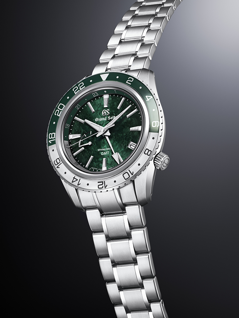 นาฬิกา Grand Seiko Spring Drive ผลิตขึ้นด้วยมือโดยช่างฝีมือผู้ชำนาญของ Shinshu Watch Studio เวิร์กช็อปตั้งอยู่ในเมืองชิโอจิริ มองออกไปเห็นภูเขาโฮทากะ ซึ่งถือกำเนิดมานานแล้วจากการปะทุของภูเขาไฟที่เปลี่ยนรูปร่างของทวีปและดันยอดเขาขึ้นมาจากด้านล่าง ลมและหิมะที่ทรงพลังได้ปั้นใบหน้าของหน้าผาเป็นเวลาหลายปีเพื่อสร้างเทือกเขาที่มีพลังซึ่งได้รับการยกย่องจากนาฬิกาสปอร์ตอันทรงพลังนี้ Sport Collection Spring Drive GMT Triple Time Zone SBGE295 มีหน้าปัดลวดลายที่แสดงถึงหน้าผาสูงชันเหล่านี้ และโดดเด่นด้วยสีเขียวที่ออกแบบมาเพื่อจับภาพความสดใสของฤดูร้อนอันสั้นของ Hotaka นาฬิกามีการเคลื่อนไหว Calibre 9R66 Spring Drive พร้อมฟังก์ชัน GMT ขอบหน้าปัดแบบหมุนได้พร้อมสเกลบอกเวลา 24 ชั่วโมงทำจากกระจกแซฟไฟร์ และเสริมด้วยวงแหวนหน้าปัดแสดงเวลา 24 ชั่วโมง พวกเขาช่วยให้ผู้สวมใส่อ่านเวลาในสามโซนเวลา