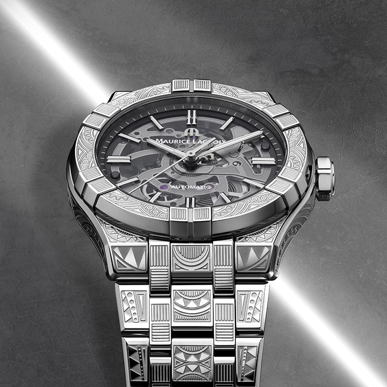 แบรนด์จาก Franches Montagnes อย่างนาฬิกา Maurice Lacroix AIKON Skeleton Urban Tribe (มอริส ลาครัวซ์ ไอคอน สเกเลตัน เออร์เบิน ไทรบ) เผยโฉมผลงานอันกล้าหาญด้วยนิยามอันโดดเด่นของงานออกแบบแห่ง Urban Tribe ในรูปแบบสเกเลตัน อันซับซ้อน และทันสมัย โดยได้รับแรงบันดาลใจมาจากงานสถาปัตยกรรมชั้นสูงของเมืองที่โดดเด่นด้วยเส้นขอบฟ้าอันมีเอกลักษณ์เฉพาะตัว ผ่านวัสดุอันหลากหลาย ไปสู่โครงสร้างคานต่างๆ ที่ดูเข้มแข็ง พาดผ่านทับซ้อนกันไปมาจนเกิดช่องว่างพื้นที่ภายใน เฉกเช่นเดียวกันกับหน้าปัดแซฟไฟร์ ที่เผยให้เห็นถึงโครงสร้างอันละเอียดอ่อนซับซ้อน ของกลไกจักรกลภายในของตัวเรือน