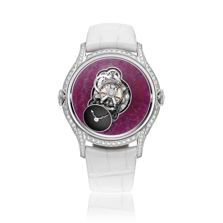 15 ปีที่แล้ว คุณณรัณ และคุณไมเคิล ได้จับมือร่วมงานกันใช่ไหมครับ หนึ่งปีหลังจากเหตุการณ์ดังกล่าวนั้น MB&F ก็ได้ร่วมเป็นพันธมิตรกับ PMT The Hour Glass และดำเนินความสัมพันธ์นี้มายาวนาน 14 ปีแล้ว และเมื่อคุณณรัณได้ขอให้ผมผลิตผลงานนาฬิกา ผมตั้งใจว่าจะต้องเป็นผลงานที่ทุกคนเห็นแล้วจะต้องร้องว้าวให้ได้ ผมจึงได้เลือกเอาคอลเลกชัน Flying T มาเป็นเรือนเวลาเพื่อการเฉลิมฉลองวาระสำคัญนี้ ในทุกๆ ปี เราจะนำเสนอคอลเลกชันเรือนเวลา Flying T ที่มาพร้อมกับพื้นหน้าปัดที่ผลิตจากหินล้ำค่าชนิดต่างๆ ยกตัวอย่างเช่น ลาพิส ลาซูลี มาลาไคต์ และไทเกอร์อาย เป็นต้น ในครั้งนี้เราได้เลือกเอา ศิลามีค่าอย่าง 'Coeur de Rubis' หรือ เอนิโอไลต์ อันเป็นอัญมณีในตระกูลเดียวกับทับทิม แต่ไม่มีความโปร่งแสงเท่ากับทับทิม อีกทั้งยังหาได้ยากยิ่งจากแทนซาเนียซึ่งเป็นประเทศเดียวที่เป็นแหล่งของอัญมณีชนิดนี้ จริงๆ ต้องกล่าวว่าเรานำอัญมณีชนิดนี้มาตกแต่งลงบนสะพานจักรไม่ใช่หน้าปัด ซึ่งต้องอาศัยความระมัดระวังในการตกแต่ง เพราะวัสดุชิ้นนี้มีรูปทรงโค้งเป็นโดมเล็กน้อย อีกส่วนหนึ่งที่น่าสนใจไม่แพ้กันคือ หน้าปัดขนาดเล็กสำหรับแสดงเวลา เดิมทีในเวอร์ชันอื่นๆ จะเป็นพื้นหน้าปัดที่ตกแต่งด้วยการลงแลกเกอร์สีดำเงางาม แต่สำหรับเวอร์ชันนี้เราเลือกที่จะผลิตพื้นหน้าปัดจากโอนิกซ์ นาฬิการุ่นพิเศษนี้เราผลิตขึ้นในจำนวนเพียง 5 เรือนเท่านั้น ผมคิดว่านี่คือผลงานที่น่าสนใจมากเพราะมีการตกแต่งด้วยหินล้ำค่าถึงสองชนิด และหินเหล่านี้เป็นหินที่มีความหมายที่ดี โดยเฉพาะ Coeur de Rubis ที่มีความหมายว่าการนำมาซึ่งความสุขและการให้กำลังใจ อันเป็นความหมายที่สื่อถึงการร่วมธุรกิจกันจนเกิดเป็น PMT The Hour Glass นั่นเอง