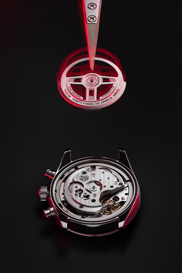 การออกแบบเชิงนวัตกรรมนี้ถือเป็นครั้งแรกสำหรับนาฬิกา TAG Heuer Carrera ที่มีความสามารถในการอ่านหลักเวลาบนหน้าปัดได้อย่างง่ายดายผ่านหน้ากระจกนาฬิกา พร้อมกับการมองเห็นกลไกซับซ้อนของนาฬิกาที่น่าสนใจได้ผ่านกระจกด้านหลังตัวเรือน อีกทั้ง ฝาหลังนาฬิกายังได้สร้างมวลเฉพาะจุดในการออกแบบเพื่อจำลองถึงพวงมาลัยรถยนต์จำนวนสามพวงที่เป็นไอคอนิกของ Porsche โดยเฉพาะ