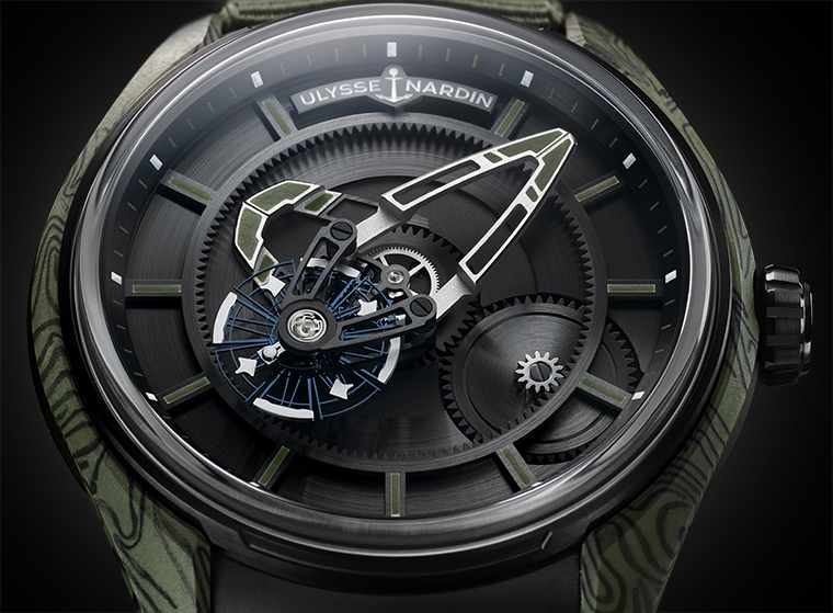 Freak [X OPS] มาพร้อมขอบตัวเรือนที่ผลิตจากคอมโพสิตคาร์บอนไฟเบอร์น้ำหนักเบาพิเศษของ Ulysse Nardin ซึ่งเป็นวัสดุที่ได้รับแรงบันดาลใจจากรูปแบบที่ผิดปกติของเหล็กดามัสกัส ที่เปิดตัวในปี 2019 ผลิตโดยการทอเส้นใยคาร์บอนด้วย (ในกรณีนี้) อีพอกซีสีเขียว เรซินทำให้มีรูปลักษณ์สามมิติดูมีเอกลักษณ์ หนึ่งเดียวไม่เหมือนใคร