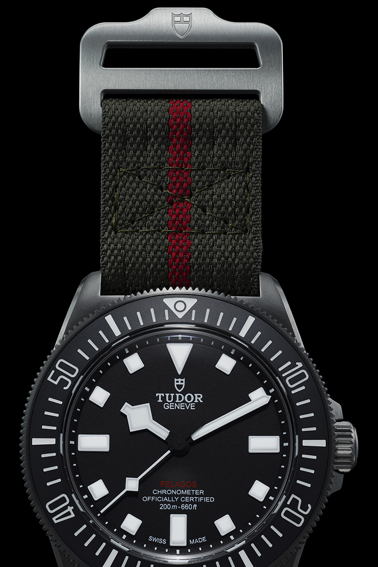 สายผ้าแบบชิ้นเดียวคือเอกลักษณ์เฉพาะตัวของ TUDOR ซึ่งเป็นหนึ่งในผู้ผลิตนาฬิกาแบรนด์แรกๆ ที่จัดจำหน่ายนาฬิกาสายผ้าในปี 2010 สายผ้าที่ผลิตโดยบริษัท Julien Faure ในเมือง St-Etienne โดยใช้เครื่องทอผ้าแจ็คการ์ดสมัยศตวรรษที่ 19 นี้มีความโดดเด่นเหนือชั้นทั้งในด้านคุณภาพ ความทนทาน และความสบายในการสวมใส่ สายนาฬิกาของรุ่น Pelagos FXD มีองค์ประกอบทางเทคนิคที่ซับซ้อนอย่างมากและเป็นผลงานการพัฒนาร่วมกันระหว่าง TUDOR และบริษัท Julien Faure สายผ้าไนลอนถักสีดำขนาด 22 มม. ซึ่งมีแถบกลางสีแดง หัวล็อคสายไทเทเนียมรูปตัว “D” และระบบยึดรัดได้เองนี้สามารถปรับความยาวให้เหมาะกับขนาดข้อมือได้และสวมใส่สบายอย่างมาก