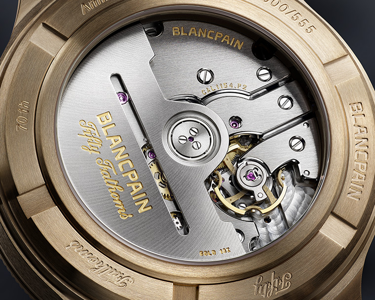 กลไก 1154.P2 อยู่ภายในตัวเรือนทองบรอนซ์ 9K กันน้ำระดับ 30 บาร์ มีขนาด 41.30 มม. เท่ากับ MIL-SPEC รุ่นประวัติศาสตร์ กระปุกคู่ช่วยให้สำรองพลังงานได้นาน 100 ชั่วโมง และซิลิคอน บาลานซ์ สปริงทำให้มั่นใจได้ว่ากลไกจะต้านทานต่ออำนาจของสนามแม่เหล็ก และนี่เป็นครั้งแรกที่ Blancpain นำเสนอกลไกนี้ในเวอร์ชั่น 1000-gauss (เกาส์) ที่เกิดขึ้นได้จากวัสดุที่เลือกใช้และอัลลอยด์เฉพาะสำหรับเอสเคปเมนท์ อีกหนึ่งข้อแตกต่างจากรุ่นต้นแบบ คือการเผยโฉมการทำงานของกลไก โดยรุ่นต้นแบบจะไม่สามารถมองเห็นการทำงานของกลไกได้ เพราะในสมัยนั้นมีวิธีเดียวที่จะต้านทานอานุภาพสนามแม่เหล็กได้ก็คือนำกลไกทั้งหมดใส่ไว้ในกรงโลหะเนื้ออ่อน ในขณะที่ Fifty Fathoms 70th Anniversary Act 3 เผยให้ยลโฉมหัวใจของกลไกผ่านคริสตัลแซฟไฟร์ใสที่กรุด้านหลัง เนื่องด้วยการใช้สปริงที่ไม่ตอบสนองต่อสนามแม่เหล็กทำให้สามารถมองเห็นการทำงานของกลไกได้อย่างชัดเจนโดยไม่สูญเสียคุณสมบัติการป้องกันผลกระทบจากสนามแม่เหล็กแต่อย่างใด เผยให้เห็นบริดจ์ที่ขยายสัดส่วนขึ้นมาเทียบเคียงกับเมนเพลท ซึ่งตกแต่งด้วยแรงบันดาลใจจากยุคก่อน สำหรับชิ้นส่วนกลไก โรเตอร์รูปทรงเรขาคณิตถ่ายทอดแรงบันดาลใจจากโรเตอร์รุ่นประวัติศาสตร์ที่มีการฉลุช่องเปิดเพื่อความละเมียดละไมยิ่งขึ้น และทนต่อแรงสั่นสะเทือนได้ดียิ่งขึ้น รวมถึงการขัดแต่งลายก้นหอยที่ชวนให้นึกถึงจังหวะการทำงานของกลไก สลักโลโก้แบบโบราณเงางามด้วยวัสดุทอง 18K ให้อารมณ์วินเทจ