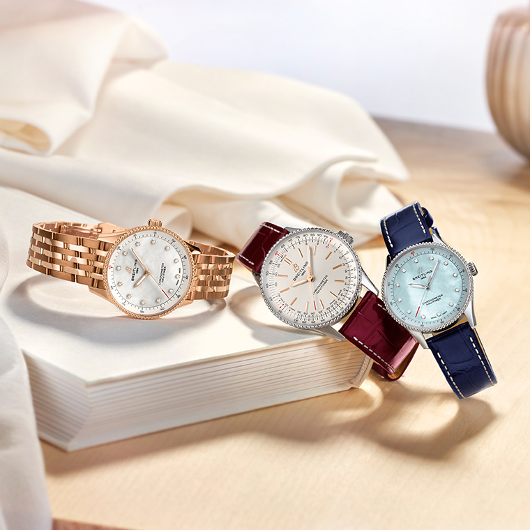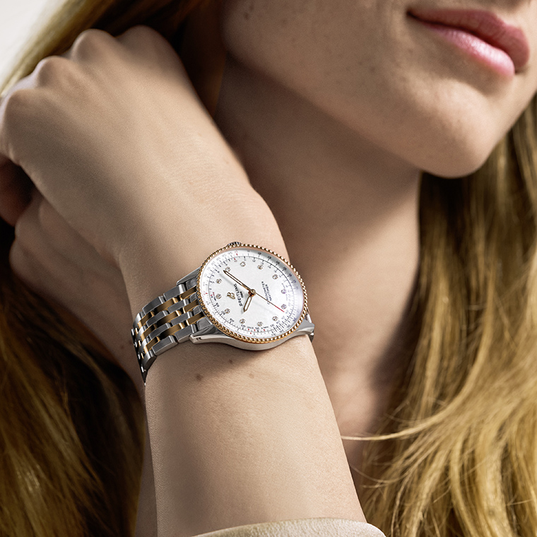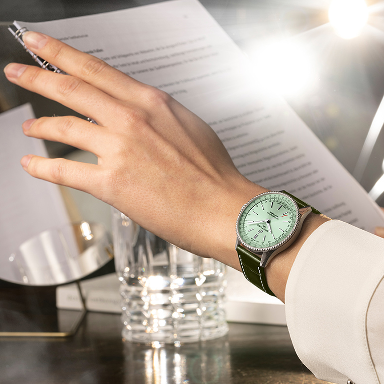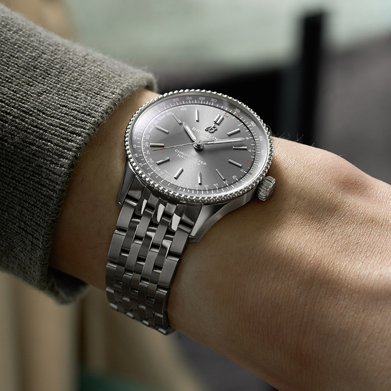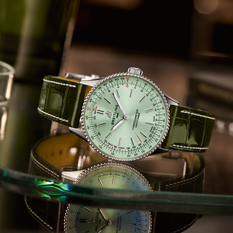 Navitimer 36mm โดดเด่นในตัวเรือนที่มีให้เลือกทั้งสเตนเลสสตีล ตัวเรือนแบบทูโทนของสตีลผสานกับทองเรดโกลด์ 18k และตัวเรือนทองเรดโกลด์ที่ทำจากทองคำที่มาจากเหมืองซึ่งตรวจสอบที่มาได้จากการรับรองของ Swiss Better Gold Association ดีไซน์ตัวเรือนยังคงเปี่ยมเอกลักษณ์ของขอบหน้าปัดที่ยกระนาบขึ้นพร้อมประดับสเกลทาคีมิเตอร์ มาตรวัดความเร็วหลักไมล์ต่อชั่วโมงหรือกิโลเมตรต่อชั่วโมง แบ่งด้วยสีดำหรือสีแดงในการใช้งาน ขอบตัวเรือนดีไซน์ลูกปัดดูงามสง่า ขาสายได้รับการขัดเงาอย่างเงางาม พื้นหน้าปัดมีให้เลือกหลากสีสวย ทั้งชมพูเปลือกหอยมุก เขียวมินต์ สีเทาเข้มหรือขาวสะอาดตา ขับเคลื่อนด้วยกลไกอัตโนมัติ คาลิเบอร์ Breitling 17 ทำงานด้วยความถี่ 28,800 ครั้งต่อชั่วโมง สำรองพลังงานได้นาน 38 ชั่วโมง รับรองมาตรฐานความเที่ยงตรงระดับ COSC ประกอบสายวัสดุเดียวกับตัวเรือนหรือประกอบสายหนังจระเข้พร้อมบานพับล็อกสาย