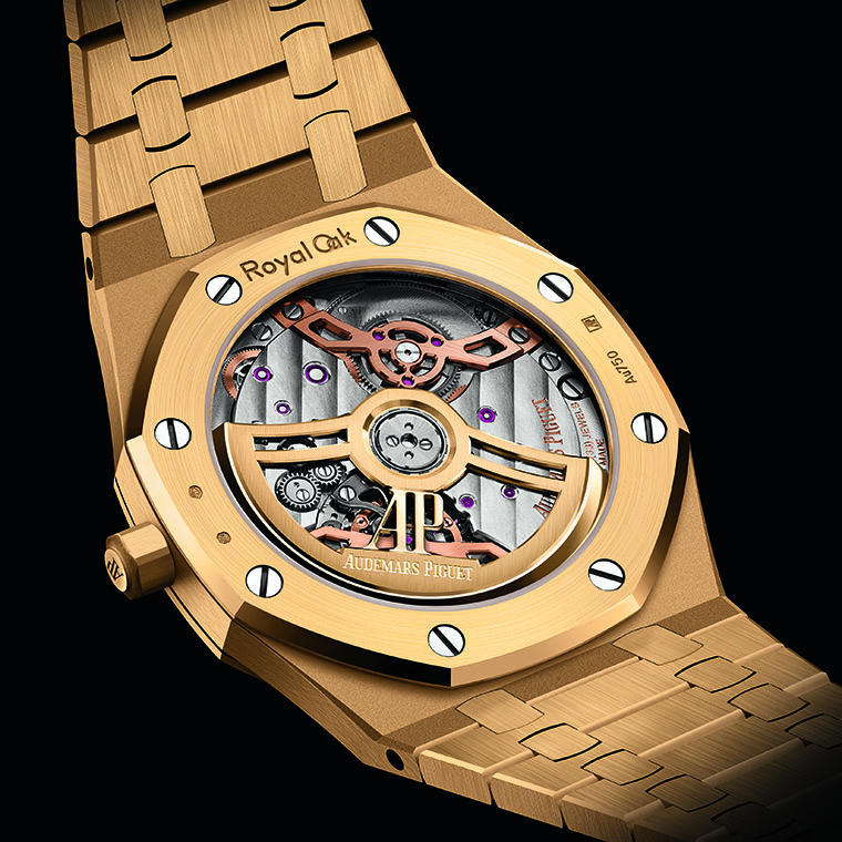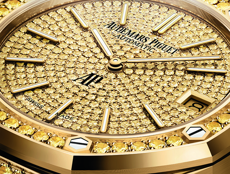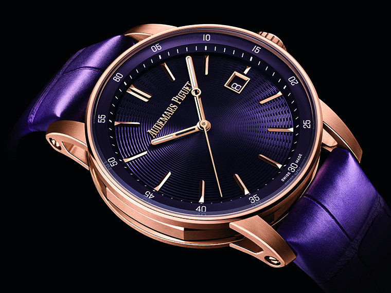 นาฬิกาทั้งสองเรือนนี้ยังมาพร้อมพัฒนาการล่าสุดของการออกแบบหน้าปัดจากคอลเลกชันนี้ นั่นคือหน้าปัดประทับลายนูนที่นำเสนอรายละเอียดของการไล่ระดับสีที่มีความโดดเด่น ซึ่ง Audemars Piguet ได้พัฒนาขึ้น ภายใต้ความร่วมมือกับช่างกิโยเช่ชาวสวิสผู้ชำนาญอย่าง “ยานน์ ฟอน ไคเนล” (Yann von Kaenel) โดยหน้าปัดดีไซน์ใหม่นี้ได้รับการตกแต่งให้ช่องเล็ก ๆ หลายร้อยช่องที่เคลื่อนออกจากศูนย์กลางดูมีรูปแบบที่แลดูคล้ายลูกคลื่น มอบเอฟเฟกต์ของสีที่เปี่ยมด้วยเอกลักษณ์ การสร้างสีม่วงและสีงาช้างของหน้าปัดทั้งสองเรือนใช้กระบวนการเคลือบสีด้วยเทคนิคพีวีดี (Physical Vapor Deposition) เพื่อรักษาและเพิ่มความลึกของลายนูน พร้อมทั้งยกระดับคุณสมบัติของการเล่นแสงให้ได้มากที่สุด เครื่องหมายบอกหลักชั่วโมงและเข็มนาฬิกาขัดเงาแบบใหม่ช่วยขับเน้นรายละเอียดที่ตัดกัน โดยเข็มนาฬิกายังเคลือบสารเรืองแสงเพื่อให้การอ่านเวลาที่เด่นชัดแม้อยู่ในที่มืด