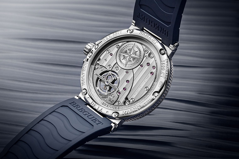 การตกแต่งกลไกของนาฬิกา Breguet รุ่นใหม่เรือนนี้ เผยให้ยลโฉมผ่านด้านหลังตัวเรือนผนึกด้วยแซฟไฟร์ ฝาครอบตลับลานสลักลาย compass rose หรือวงกลมแสดงทิศ พร้อมด้วยรายละเอียดการตกแต่งที่เป็นเอกลักษณ์ของคอลเลคชั่น Marine ซึ่งรวมถึงลายทาง