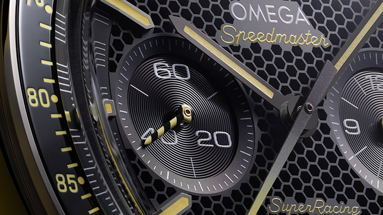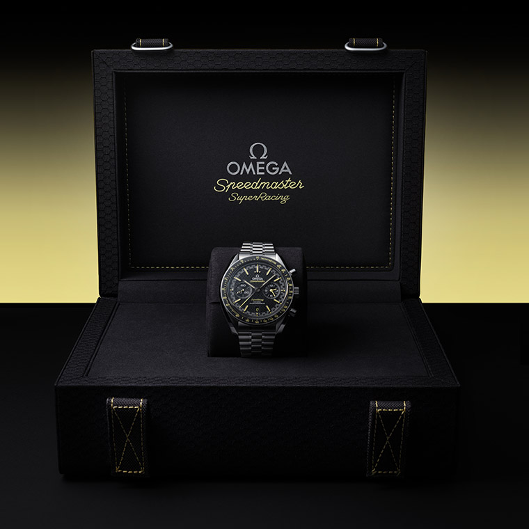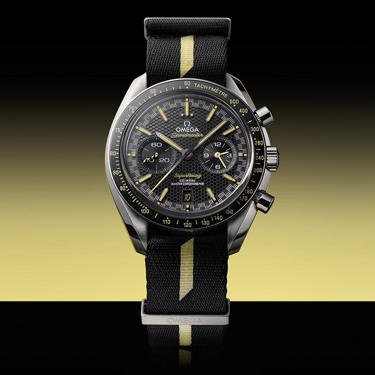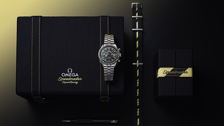 นอกจาก Speedmaster Super Racing รุ่นใหม่จะมาพร้อมกับสายนาฬิกาโลหะแล้วยังประกอบด้วยตัวเลือกสุดสปอร์ตอย่างสาย NATO ไนลอนรีไซเคิลลายแถบสีดำและสีเหลืองซึ่งอ้างอิงมาจากรหัสสีอันโดดเด่นของ Seamaster Aqua Terra >15’000 GAUSS ที่เผยโฉมเมื่อ 10 ปีก่อน