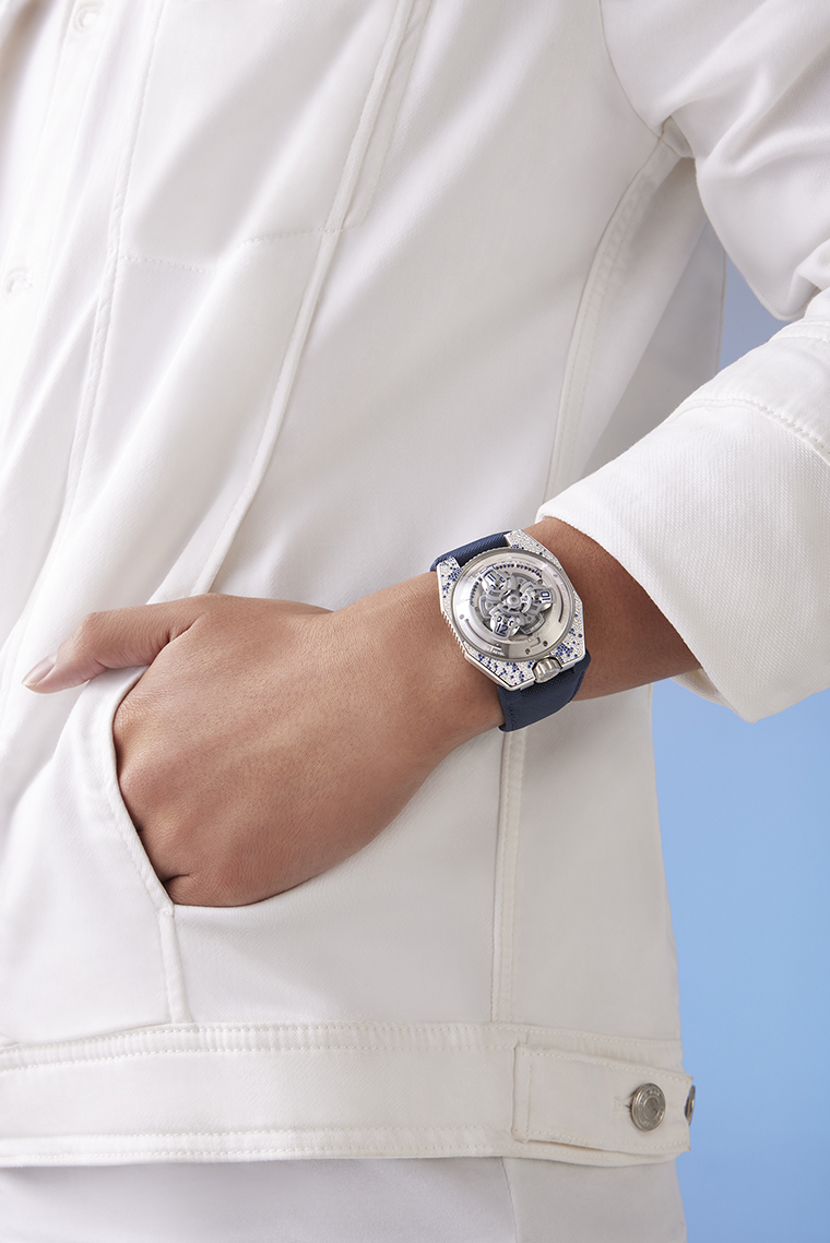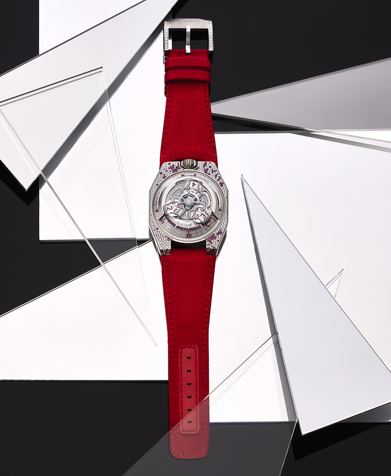 แซฟไฟร์ ทับทิม มรกต ส่องแสงระยิบระยับ บนตัวเรือนของ UR-100V PMT The Hour Glass 15th Anniversary ทั้งสามผลงาน สะท้อนถึงการเดินทางก้าวข้ามผ่านกาลเวลาและห้วงอวกาศ แนวคิดทั้งสองถูกถ่ายทอดลงนาฬิกาเดียวกัน ดึงดูดประสาทสัมผัสการรับรู้อันละเอียดอ่อนแต่แฝงไว้ด้วยลูกเล่นของ “เวลาหรืออวกาศ” และ “นาทีหรือกิโลเมตร” การนำมาตรวัดทั้งสองส่วนมาหลอมรวมเข้าด้วยกัน เชื้อเชิญให้ร่วมชื่นชมเรื่องราวอันสุดประทับใจของการเดินทางบนท้องฟ้า นอกเหนือจากการแสดงเวลาชั่วโมงและนาทีผ่านเทคโนโลยีดาวเทียมแล้ว ด้วยมิติใหม่ของการแสดงเวลา การเคลื่อนที่ของเข็มนาทีหลังจากครบ 60 นาทีแล้ว จะหายไปและกลับมาอีกครั้ง โดยทำหน้าที่บอกหน่วยนับกิโลเมตร แปลมาตรวัดจากการเดินทางอันเงียบงันในจักรวาล การเคลื่อนที่ของโลกหมุนรอบแกนตัวเองในทุกๆ 20 นาที ซึ่งจะเดินทางประมาณ 555 กิโลเมตร นี่คือความเร็วของโลกที่หมุนรอบเส้นศูนย์สูตร ส่วนทางด้านตรงข้ามจะมาพร้อมมาตรวัดการหมุนของโลกรอบดวงอาทิตย์ ซึ่งมีค่าเท่ากับ 35,740 กิโลเมตรต่อ 20 นาที มาตรการนี้เป็นเครื่องเตือนใจในฐานะมวลมนุษยชาติ เวลาชั่วโมงและระยะทางกิโลเมตรที่ปรากฏ ล้วนมีความสำคัญ ดังนั้นนาฬิกานี้จึงมีชื่อเรียกว่า UR-100V “SpaceTime”